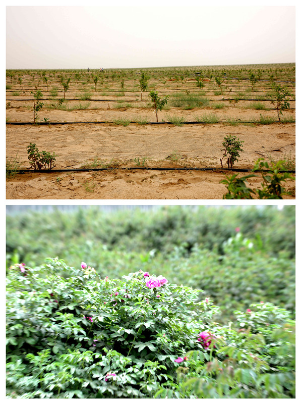 上圖為七仙女防沙治沙標(biāo)桿項(xiàng)目區(qū)套種的玫瑰和桃樹,下圖為七仙女村的玫瑰(攝于2025年6月16日)。新華社記者劉詩平 攝