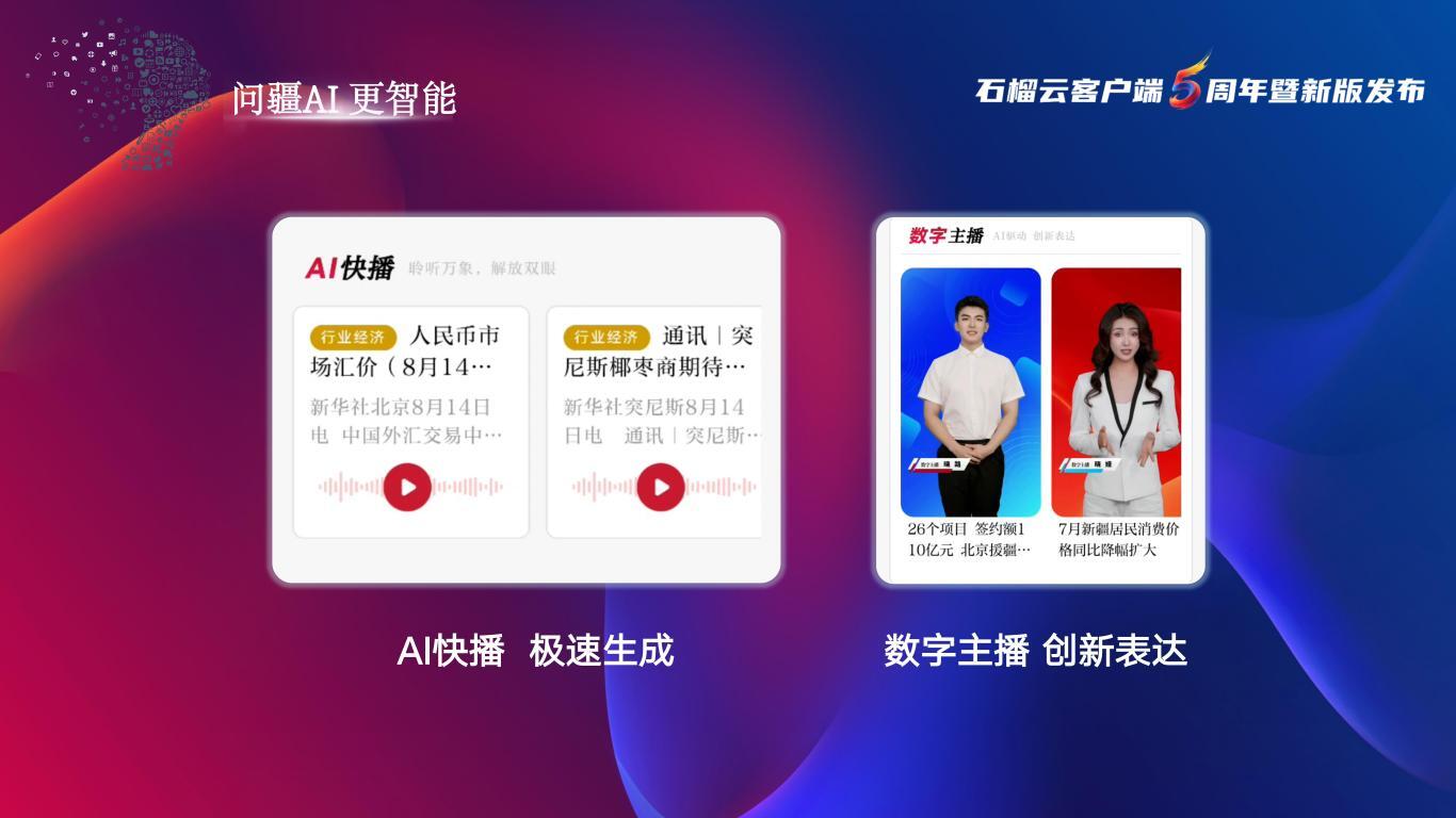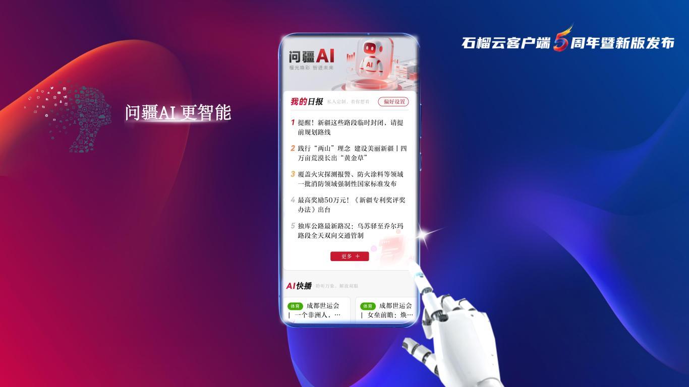 儀式上,石榴云客戶端7.0版正式上線。新版客戶端著重于AI智能化應(yīng)用和服務(wù)能力升級(jí),“四大亮點(diǎn)”令人耳目一新。一是“未來版”更新潮,采用“單列瀑布流+個(gè)性化推薦算法”設(shè)計(jì),帶給用戶“開盲盒”的期待感;二是“問疆AI”更智能,“我的日?qǐng)?bào)”“AI問政”“AI快播”等智能應(yīng)用帶來交互式體驗(yàn);三是“石榴圈”更好玩,構(gòu)建“新聞+社交”雙向傳播生態(tài);四是7位炫酷“數(shù)字主播”,給用戶有溫度的陪伴。