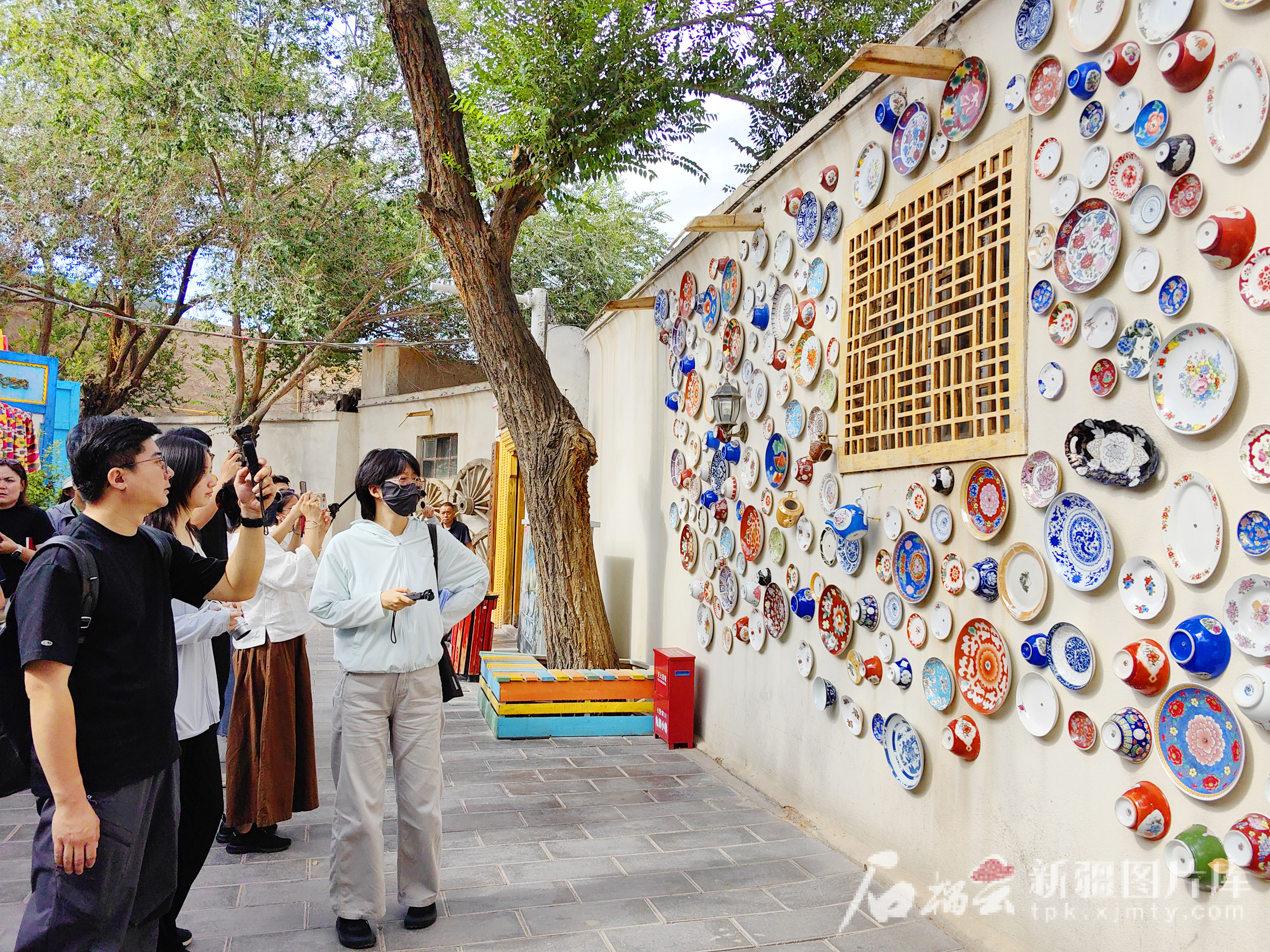 8月13日,采訪團(tuán)在觀賞龜茲小巷墻上的裝飾品。