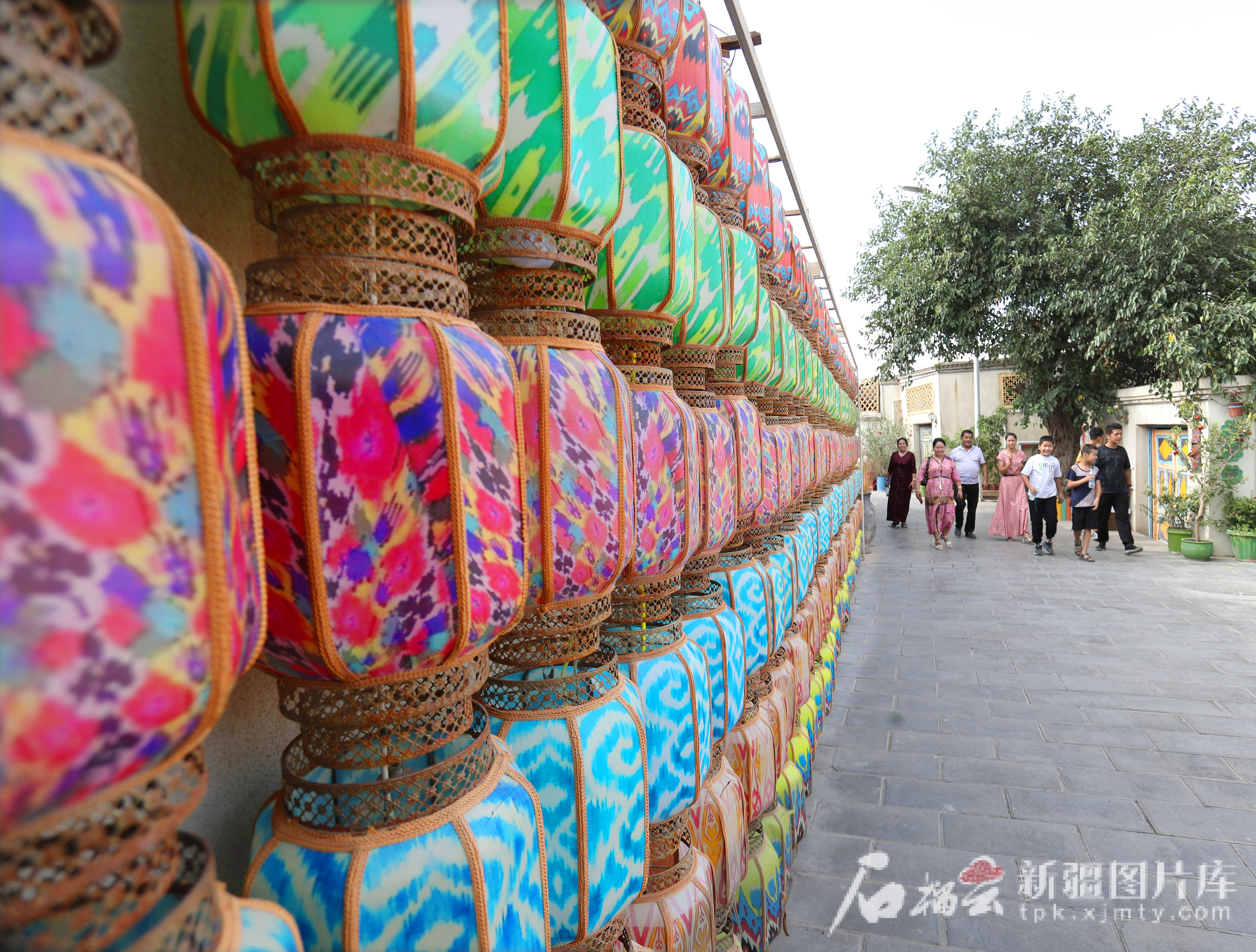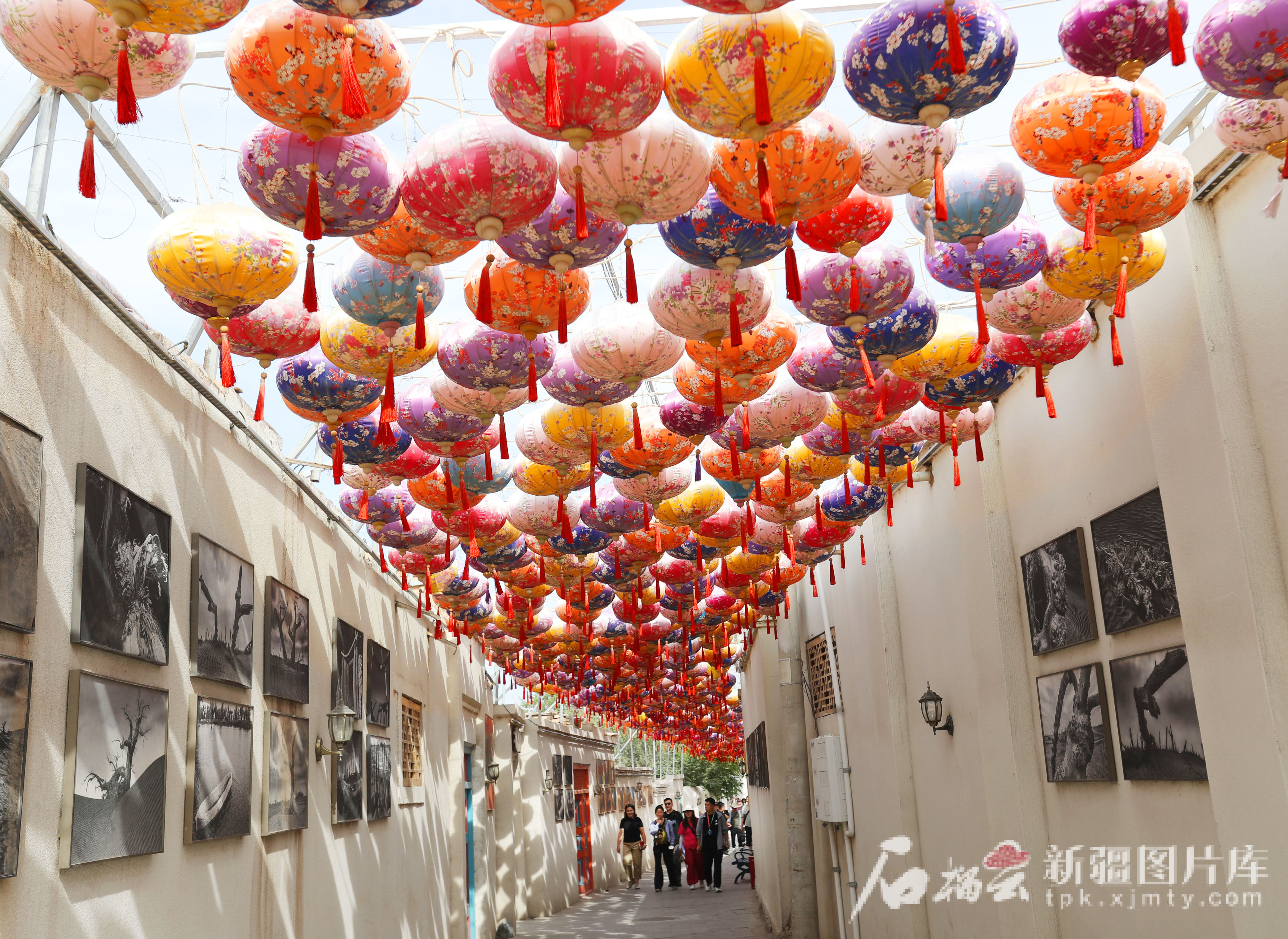 8月13日,游客在龜茲小巷參觀艾德萊斯燈籠墻。