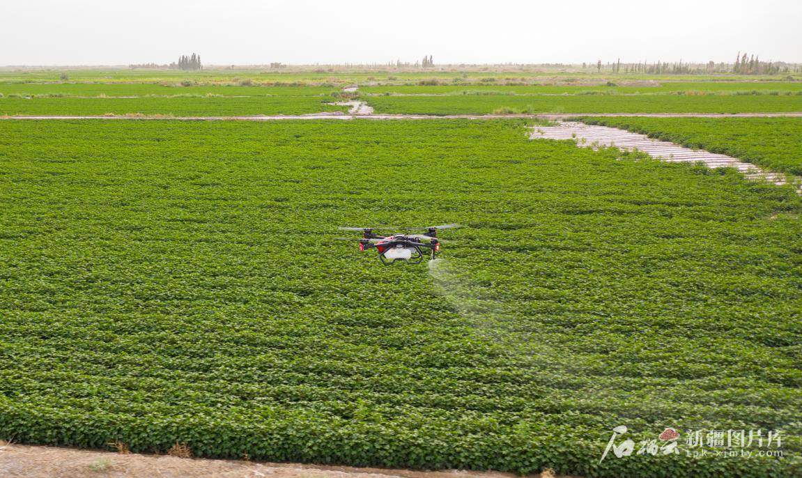 盛夏時(shí)節(jié),尉犁縣“超級(jí)棉田”上空,無(wú)人機(jī)正在打藥。圖片由艾海鵬提供