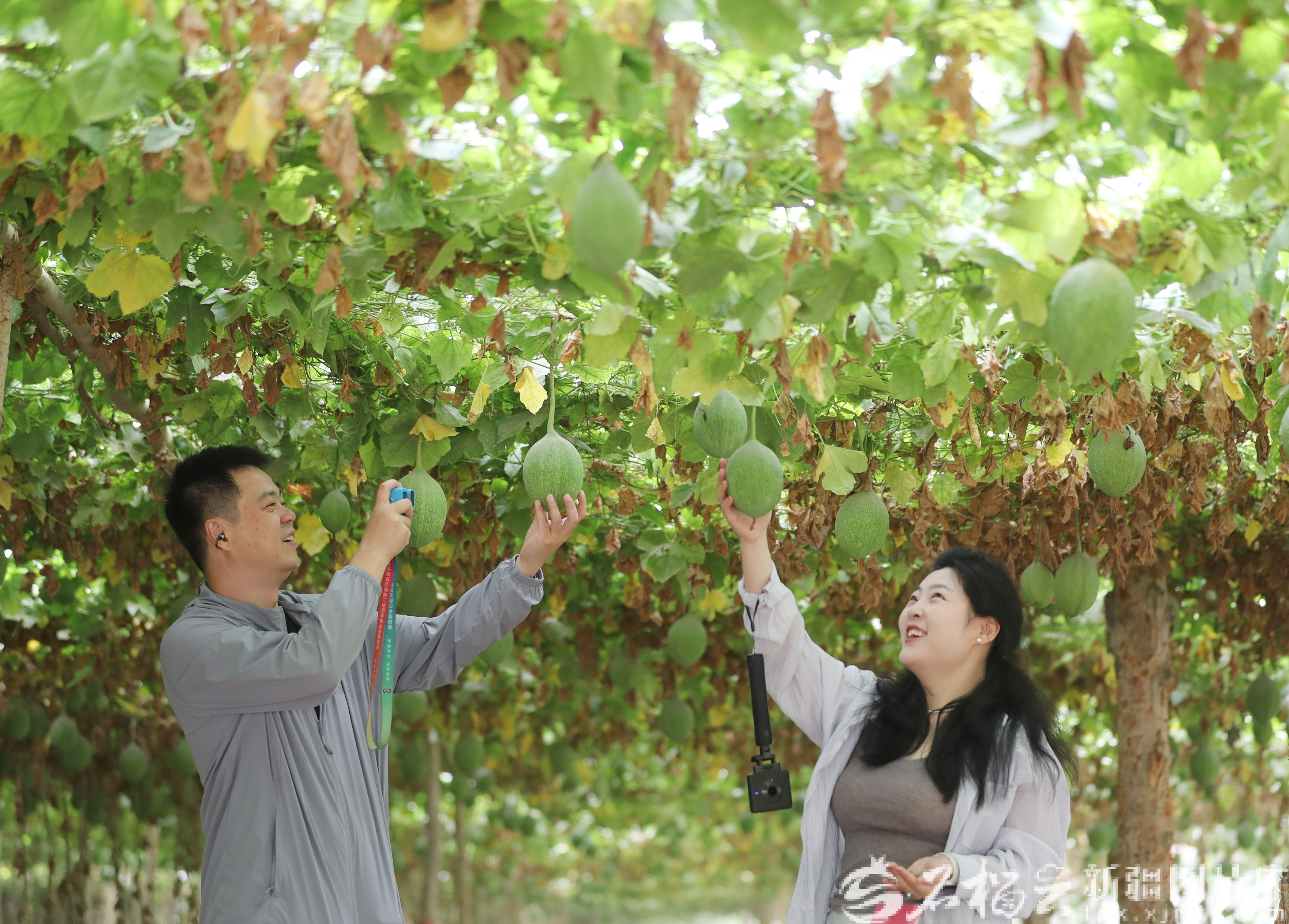8月16日,采訪團(tuán)成員在皮山縣徽岳記瓜蔞種植基地了解架瓜蔞的生長情況。