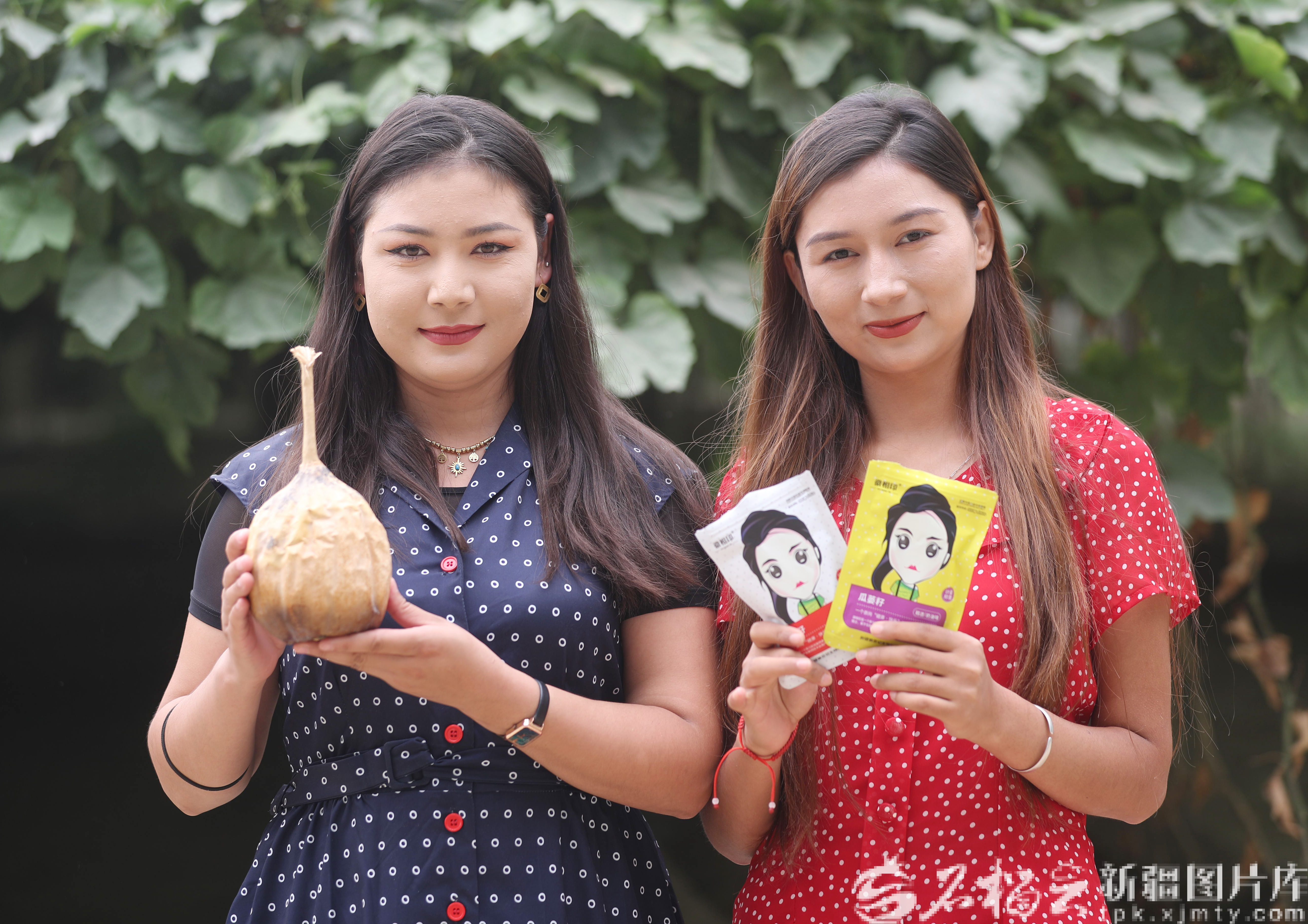 8月16日, 皮山縣徽岳記瓜蔞種植基地工作人員展示瓜蔞產(chǎn)品。