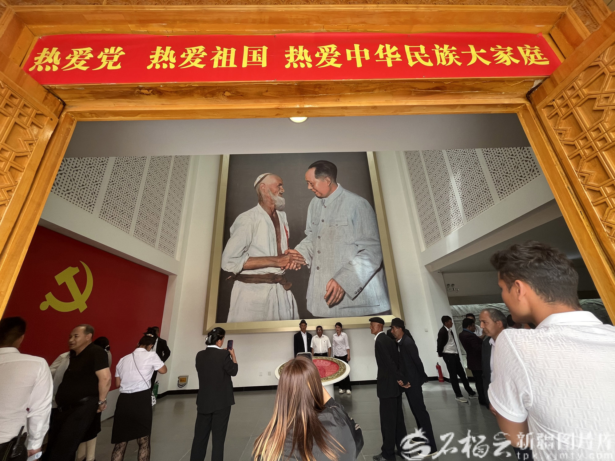8月17日黃昏,于田縣托格日尕孜鄉(xiāng)托格日尕孜村的庫爾班·吐魯木紀(jì)念館漸漸安靜下來。如克亞木·麥提賽地送走最后一批參觀者,轉(zhuǎn)身望向大廳中央——那張熟悉的畫像里,她的曾外祖父庫爾班·吐魯木緊握毛主席的手,側(cè)身凝望,目光熾熱。
