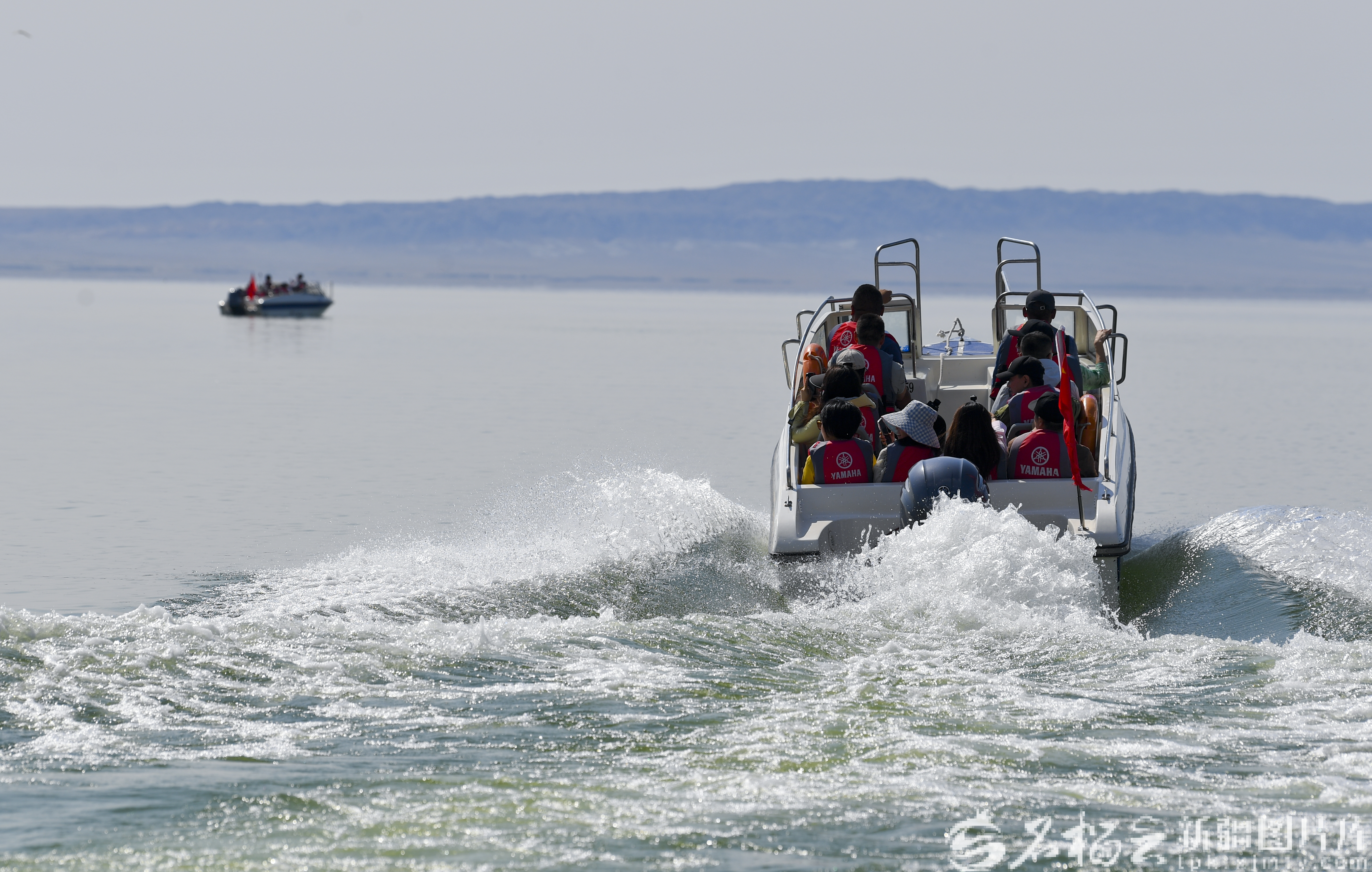 9月8日,游客在烏倫古湖海上魔鬼城景區(qū)乘坐快艇。