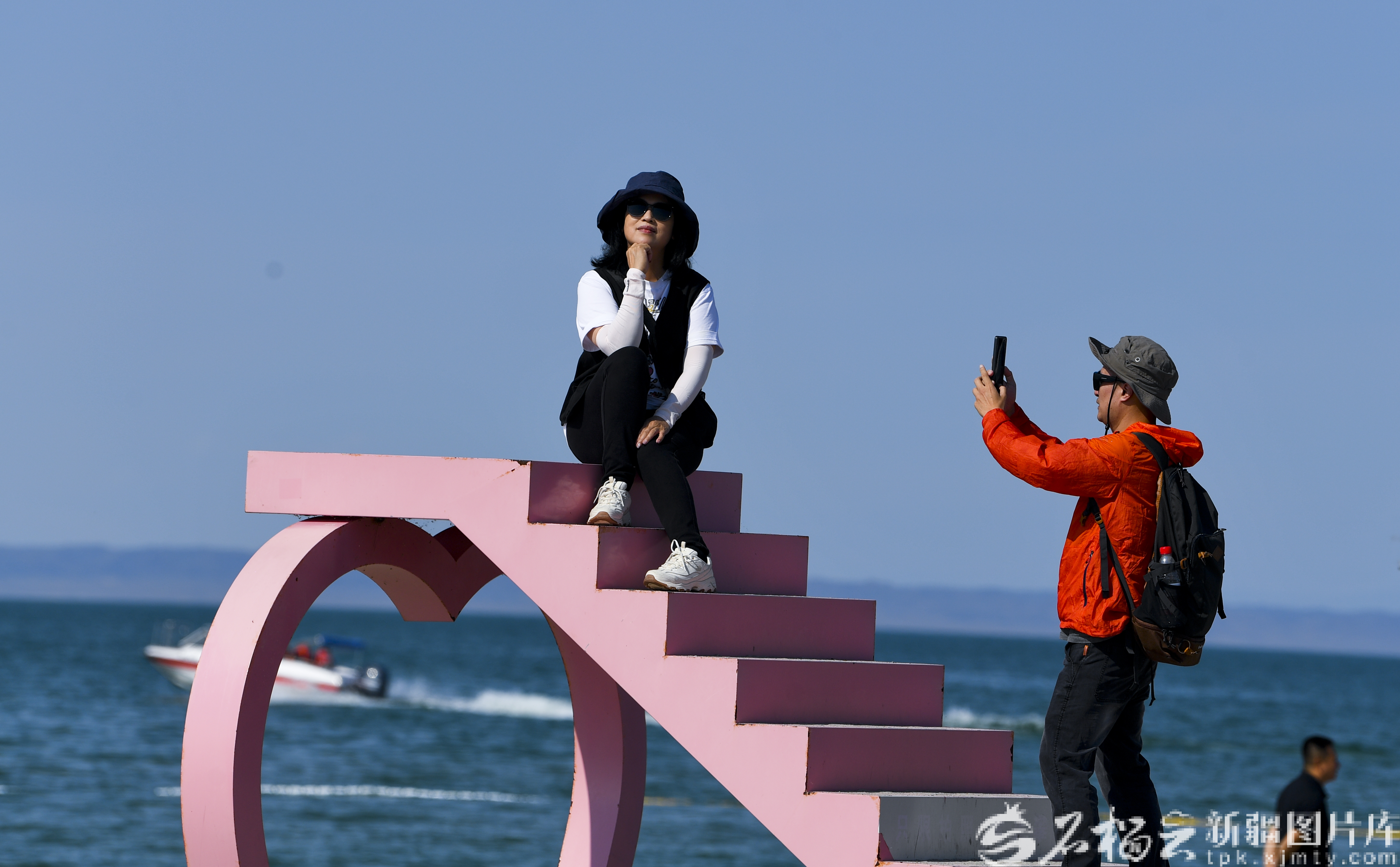 9月8日,游客在烏倫古湖金沙灘景區(qū)打卡拍照。