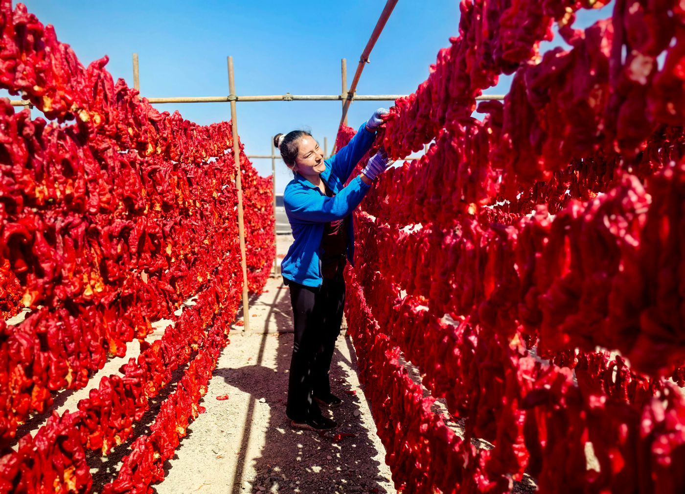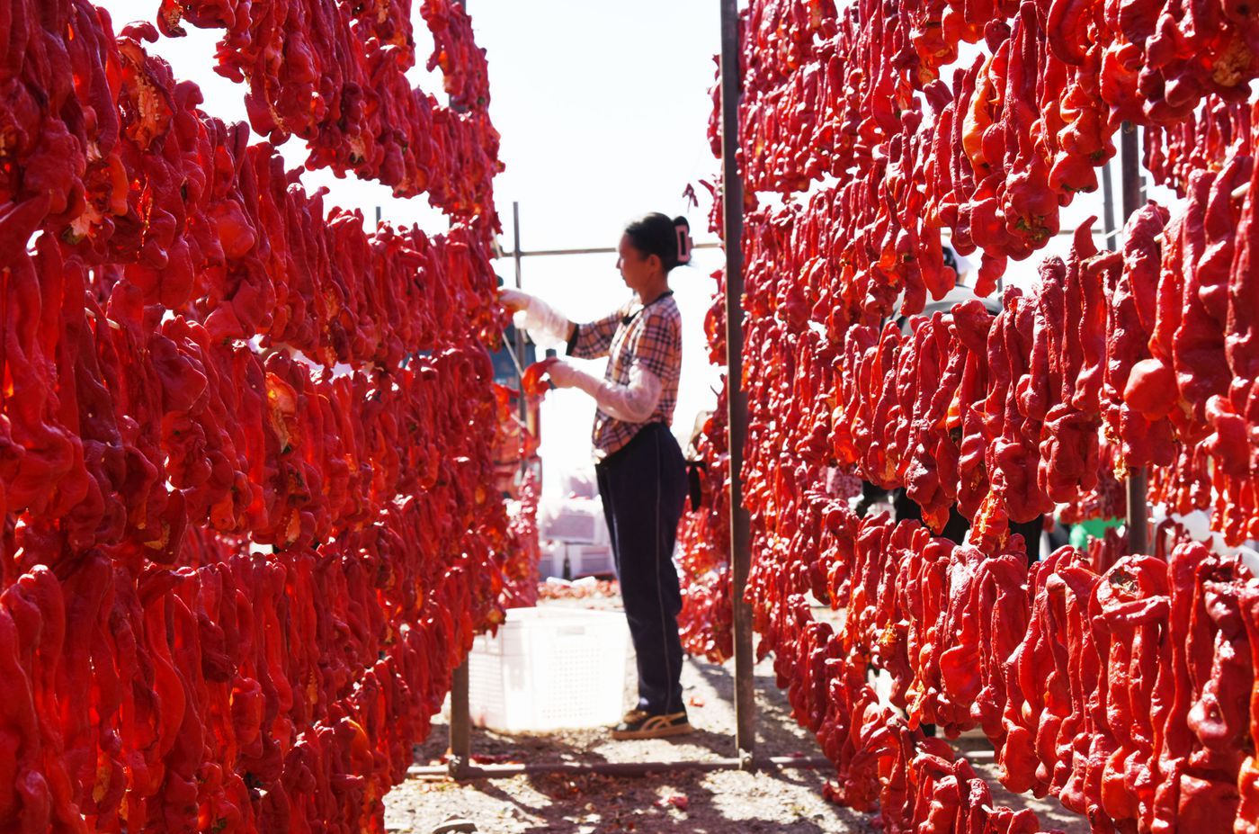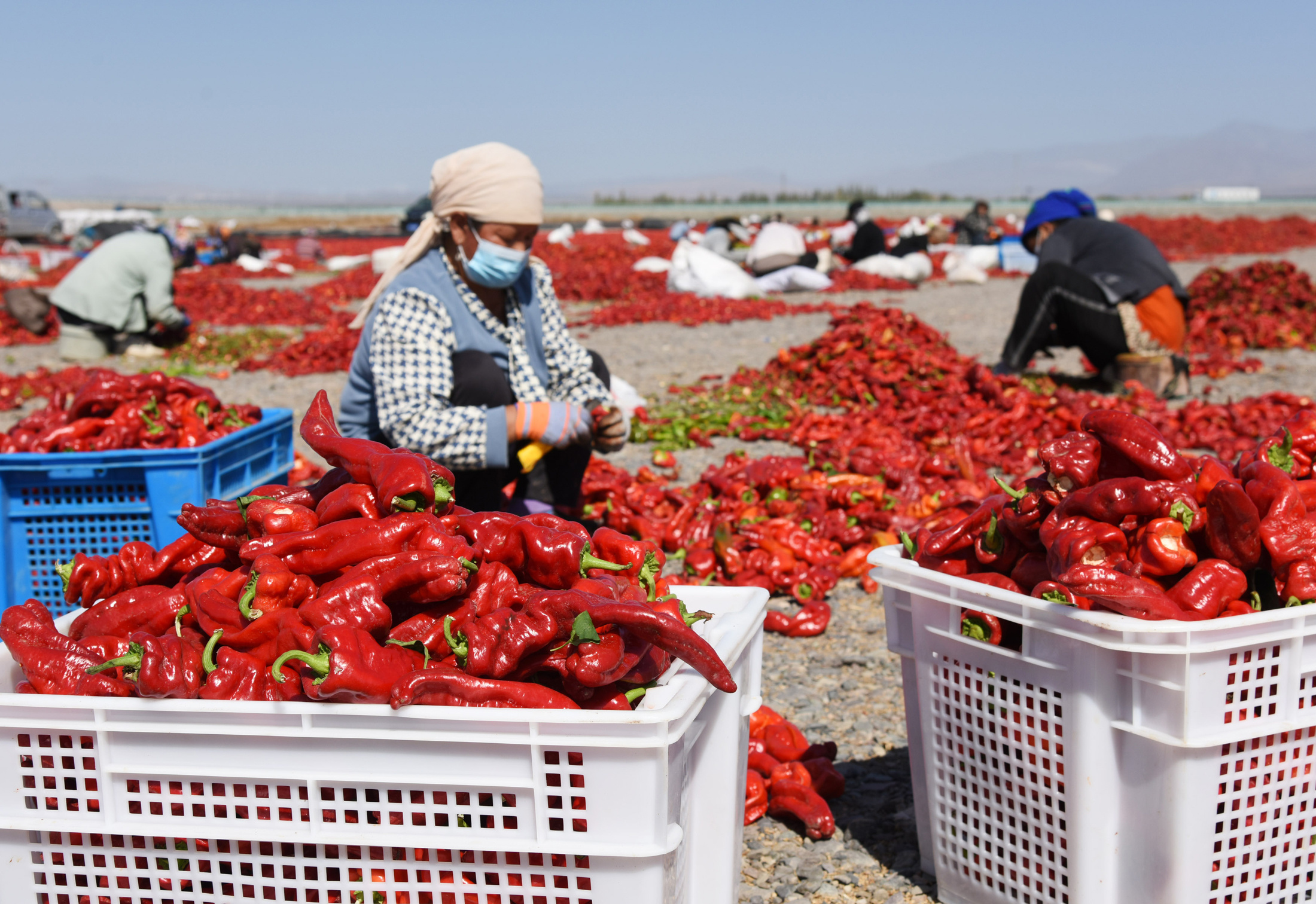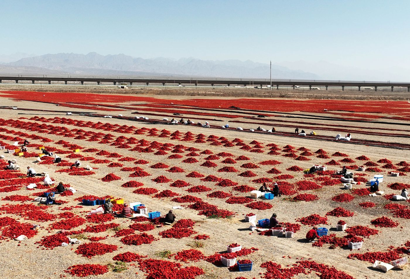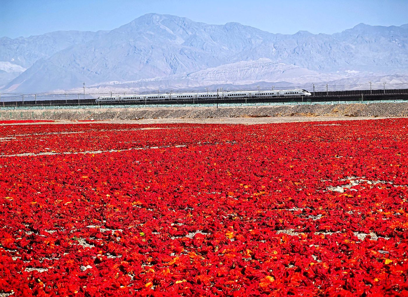 9月16日,新疆吐魯番市高昌區(qū)紅柳河的廣袤戈壁上,火紅一片的辣椒晾曬場呈現(xiàn)豐收的壯觀。一列高鐵從旁邊疾馳而過,宛如穿梭于紅毯上,構(gòu)成一幅有趣的畫面。