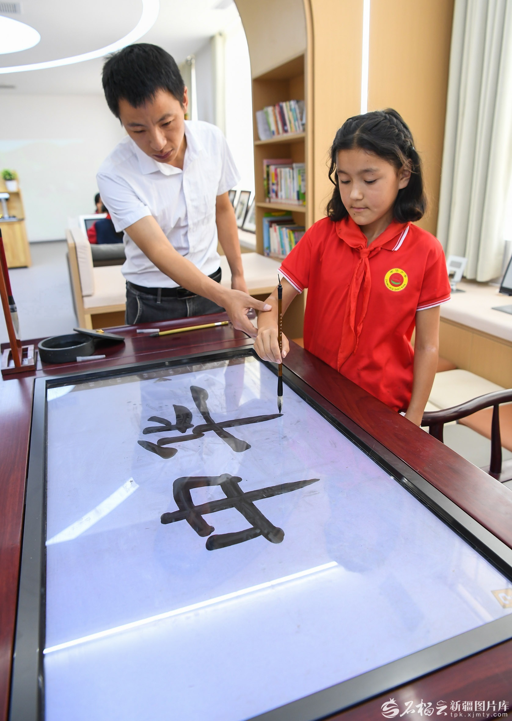 9月19日,疏附縣托克扎克鎮(zhèn)中心小學(xué)學(xué)生援疆教師的指導(dǎo)下學(xué)習(xí)書法。