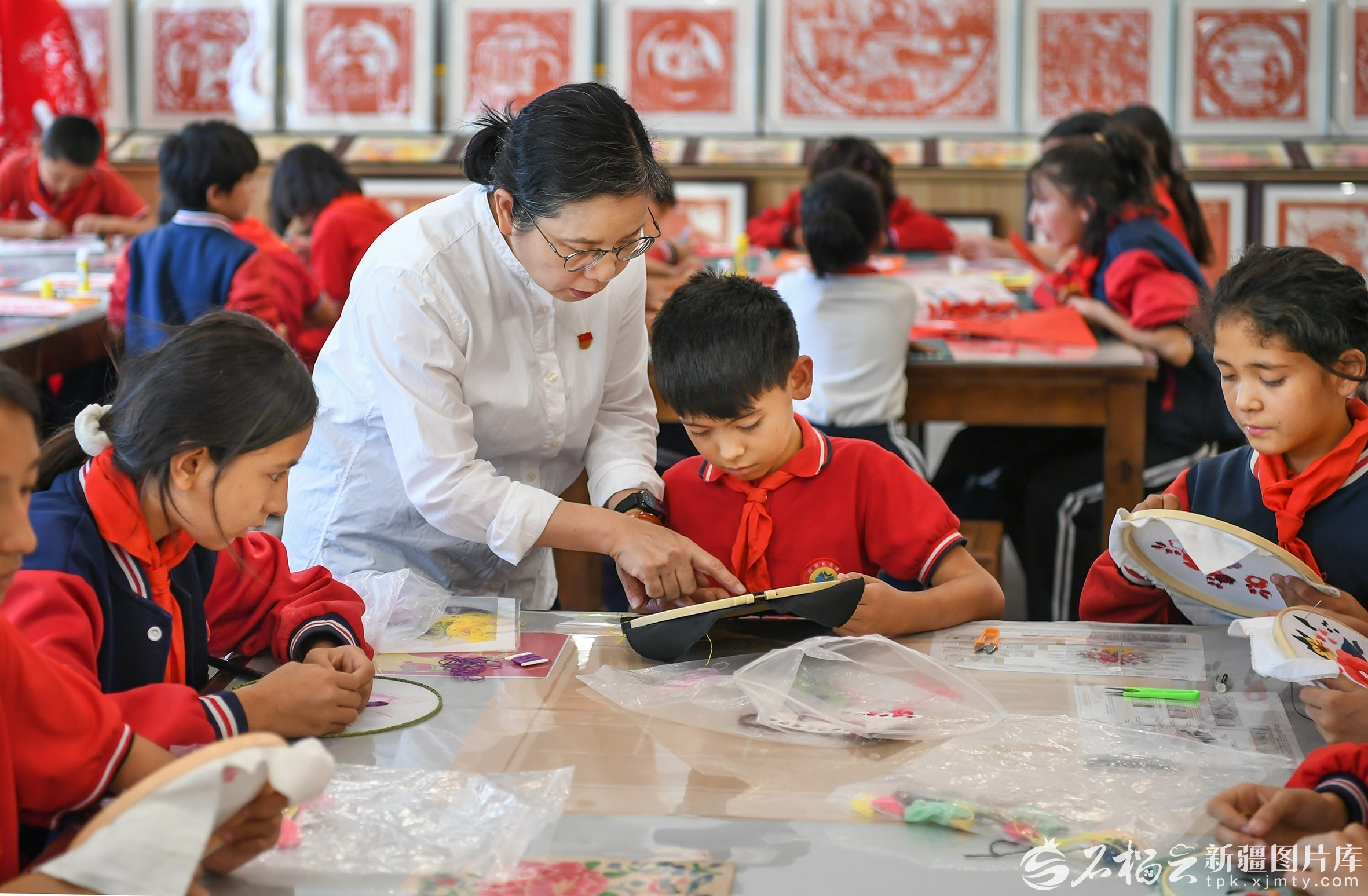 9月19日,疏附縣托克扎克鎮(zhèn)中心小學(xué)學(xué)生在援疆教師的指導(dǎo)下學(xué)習(xí)刺繡。