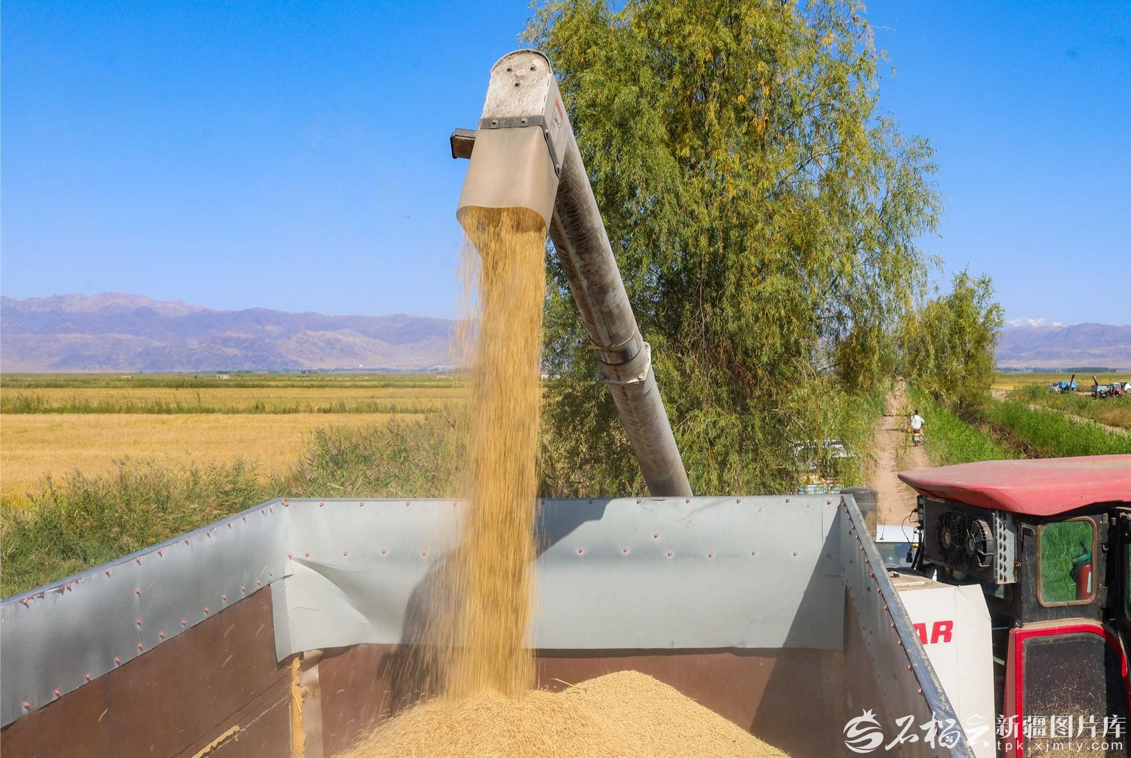 9月22日,收割機在新源縣肖爾布拉克鎮(zhèn)喀克村水稻田里作業(yè)。張文庭攝