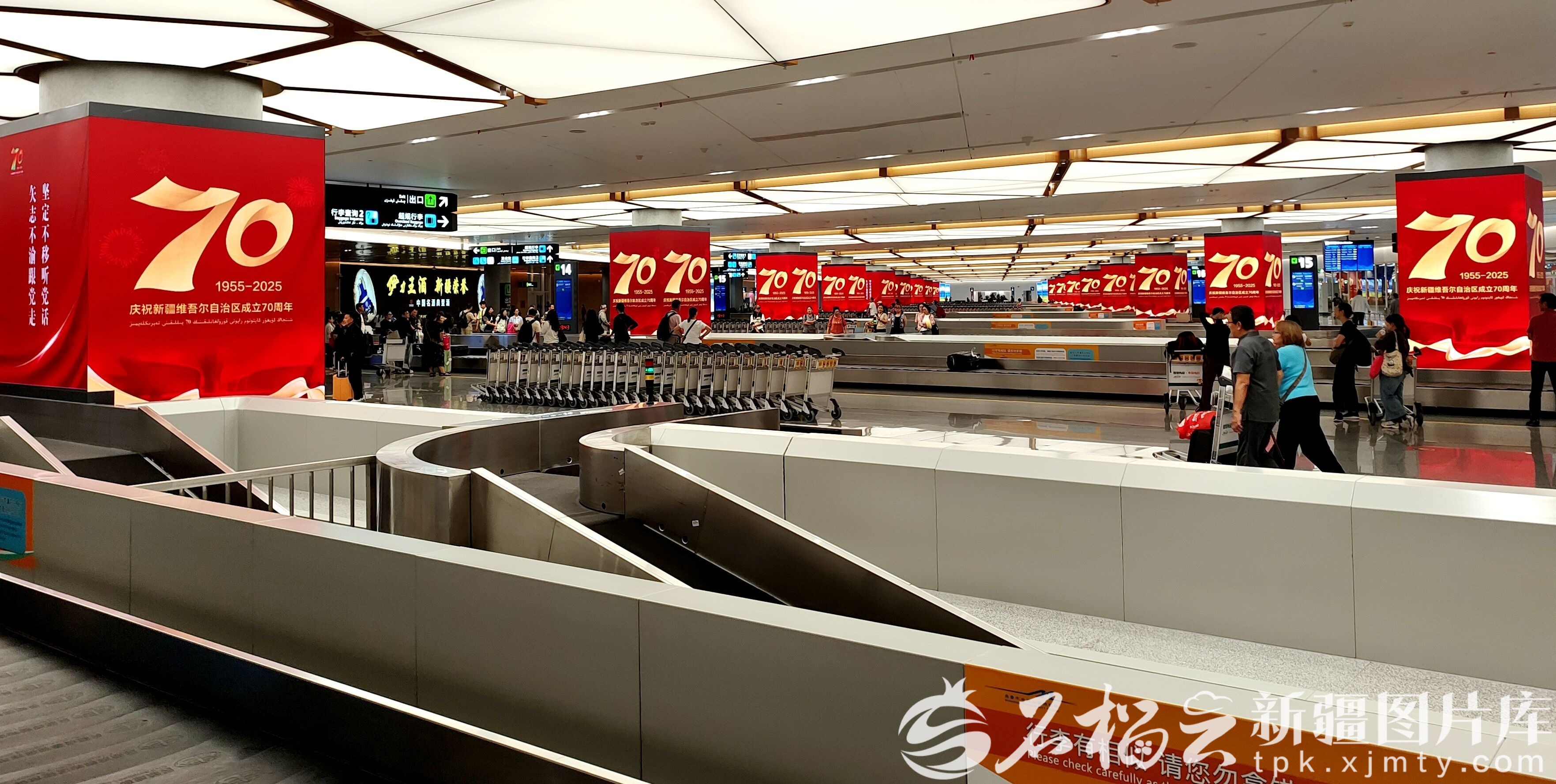 在烏魯木齊天山國際機場內(nèi),LED屏循環(huán)播放著慶祝新疆維吾爾自治區(qū)成立70周年的標語。
