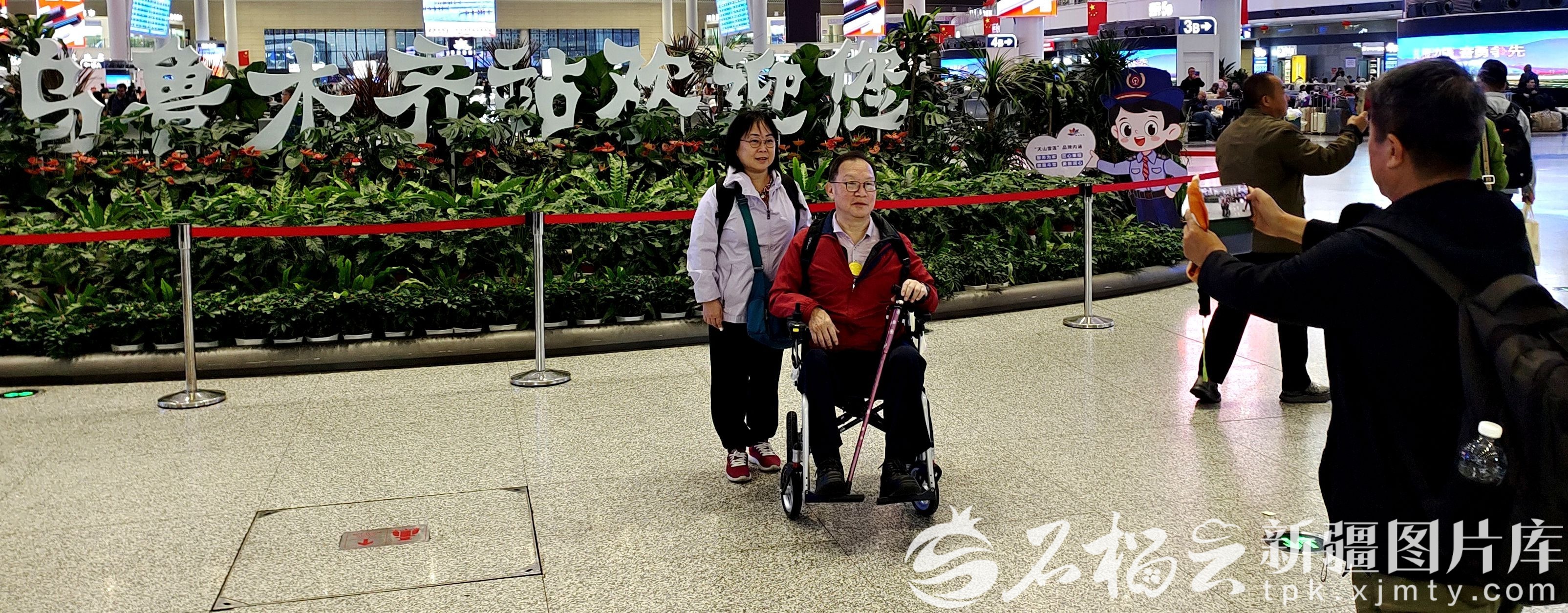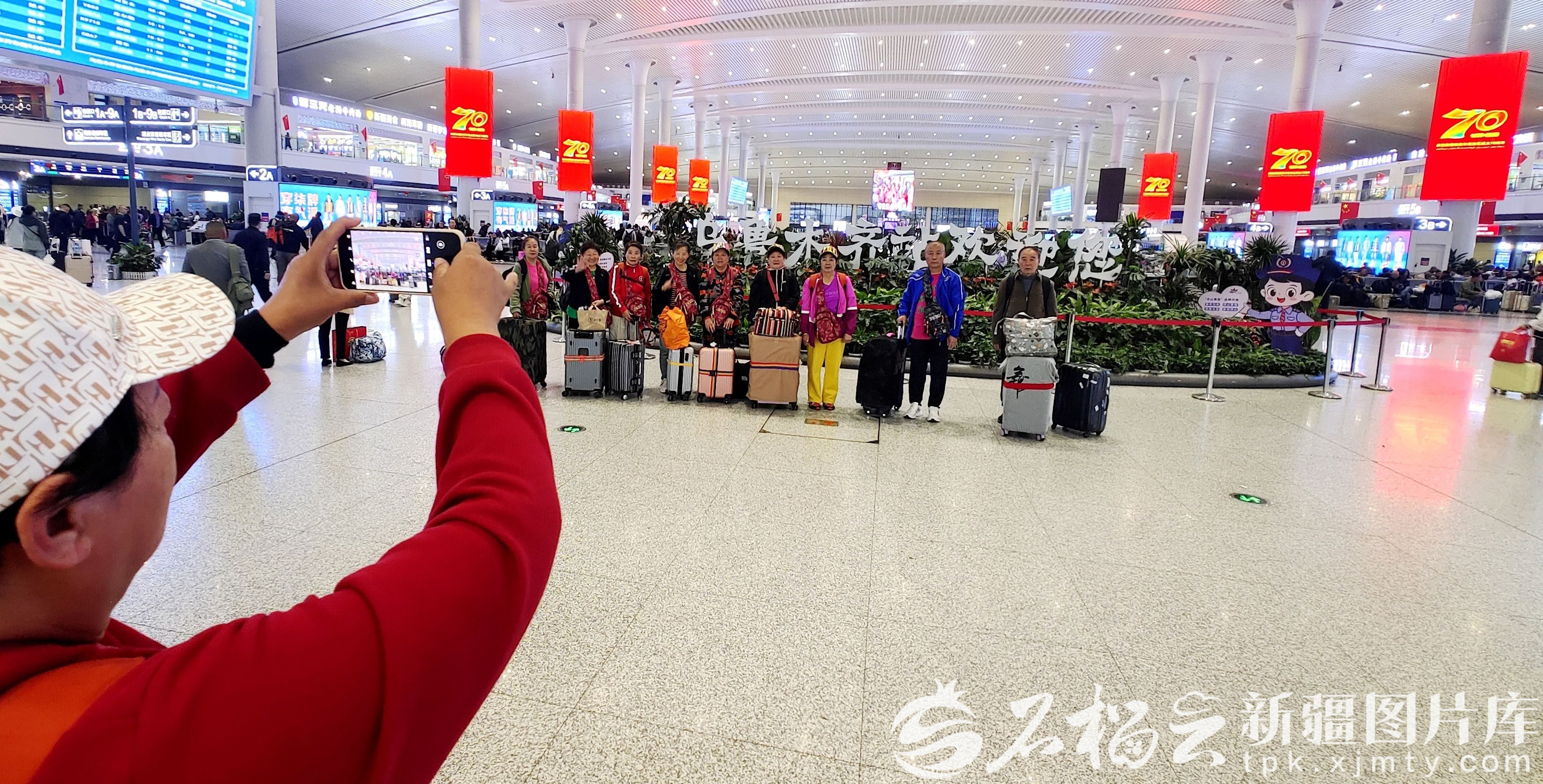 在烏魯木齊站,各地游客紛紛舉起手機打卡留念,鏡頭里的笑容與新疆維吾爾自治區(qū)成立70周年標識相映成景。候車大廳內(nèi),往來旅客也感受到這份喜慶。