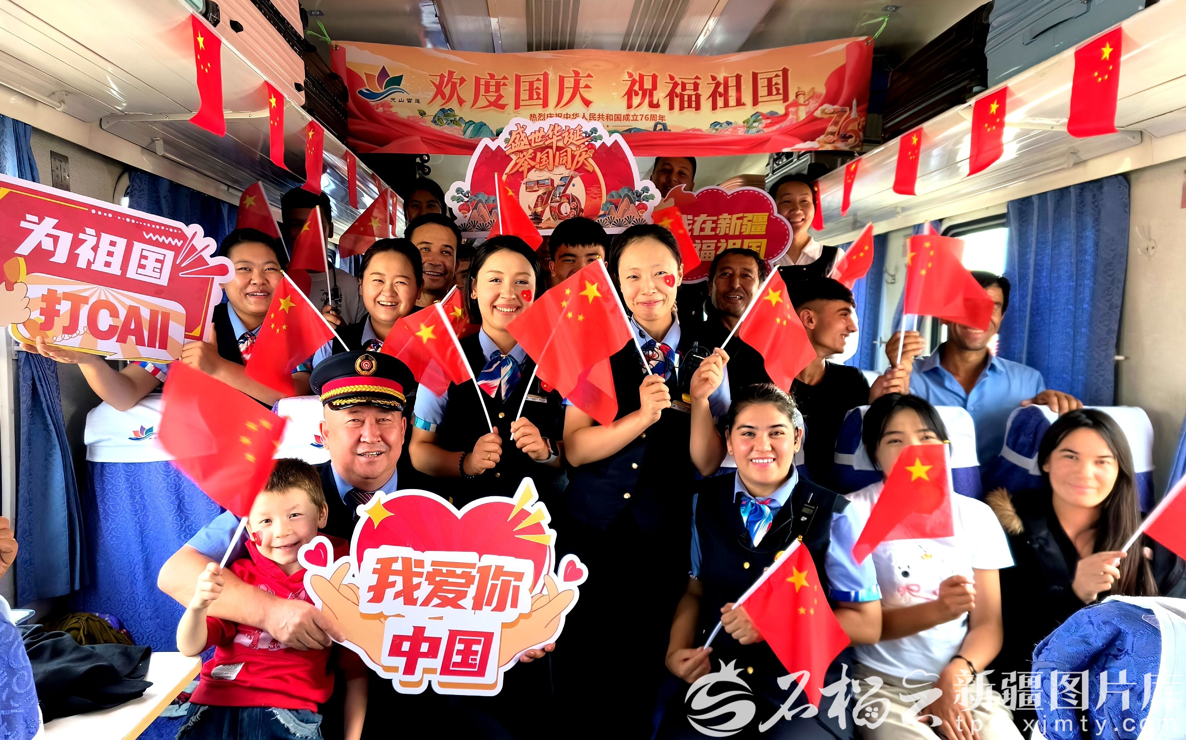 列車是流動的風景。烏魯木齊局集團有限公司庫爾勒客運段和田二隊和普三組值乘的烏魯木齊-和田7557次“和田玉龍?zhí)枴避噹?,喜慶燈籠與新疆維吾爾自治區(qū)成立70周年標識裝點其間,廣播里循環(huán)播放著《我和我的祖國》《我愛你中國》等經(jīng)典歌曲,旅客跟著動人的旋律唱起來。