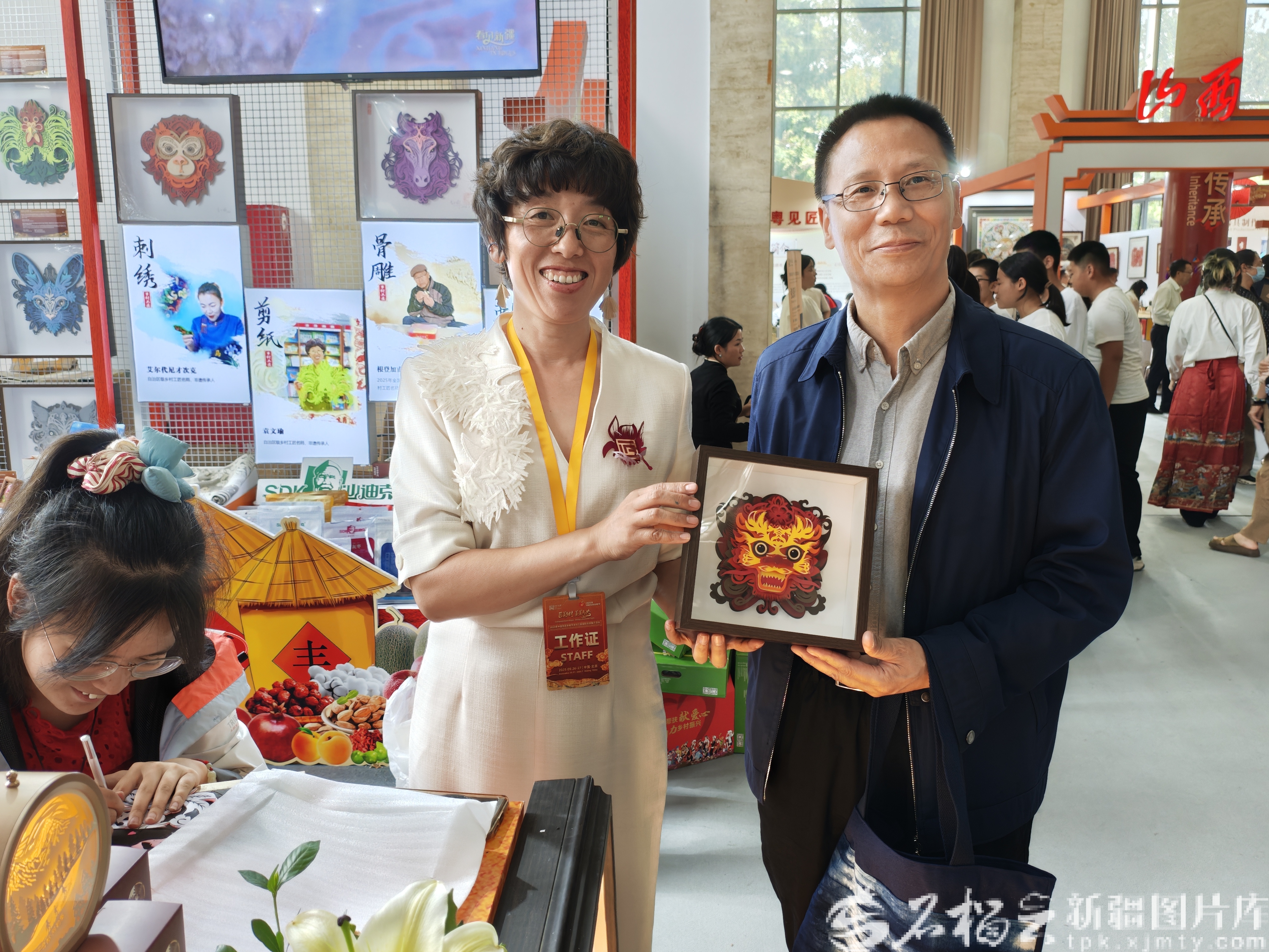 9月26日,2025年中國農民豐收節(jié)鄉(xiāng)村工匠國際交流推介活動期間,自治區(qū)級鄉(xiāng)村工匠名師袁文瑜向觀眾展示剪紙作品。天山網-新疆日報記者 劉毅攝