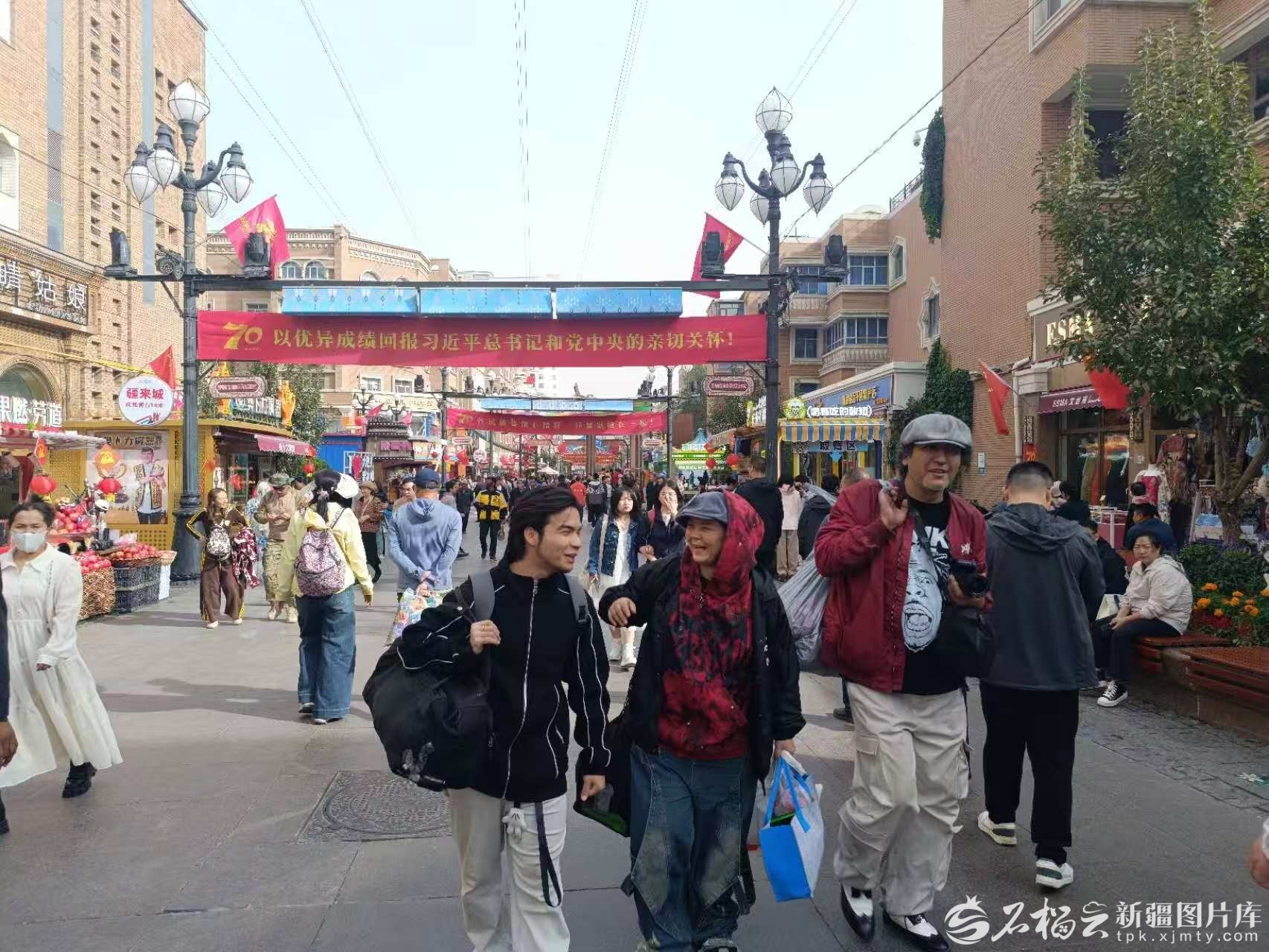 在步行街上,人潮涌動(dòng),隨處可以看到手里揮動(dòng)著國(guó)旗的游客、市民,他們并不相識(shí),但是心愿都是同一個(gè):祝福祖國(guó)繁榮昌盛。來自四川的游客張昊然和同伴們,原本正在挑選手鼓,忽然身邊有人齊唱《我和我的祖國(guó)》——原來是大巴扎步行街舉行的“我把新疆唱給你聽”快閃活動(dòng)。很快,他們就加入合唱的隊(duì)伍,“在‘歌舞之鄉(xiāng)’唱這首歌,感覺每個(gè)音符都帶著葡萄干的甜蜜!”他說,在新疆旅游,最讓他們感動(dòng)的,就是“感受新疆的團(tuán)結(jié)氛圍”,“互不相識(shí)的游客與當(dāng)?shù)厝嗽谝黄?,揮動(dòng)國(guó)旗齊聲高歌的場(chǎng)景,太感人了!”