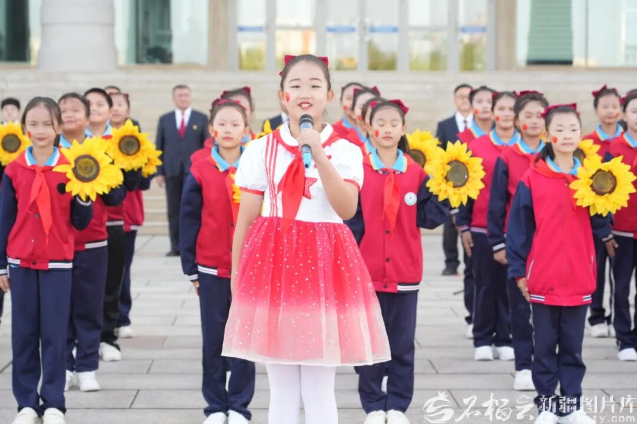 10月1日,哈密市在伊州區(qū)時(shí)代廣場(chǎng)舉行升國(guó)旗儀式,隆重慶祝中華人民共和國(guó)成立76周年。圖為參加儀式的優(yōu)秀共產(chǎn)黨員、勞動(dòng)模范和各界先進(jìn)模范代表共唱國(guó)歌。麥麥提·玉蘇普 攝