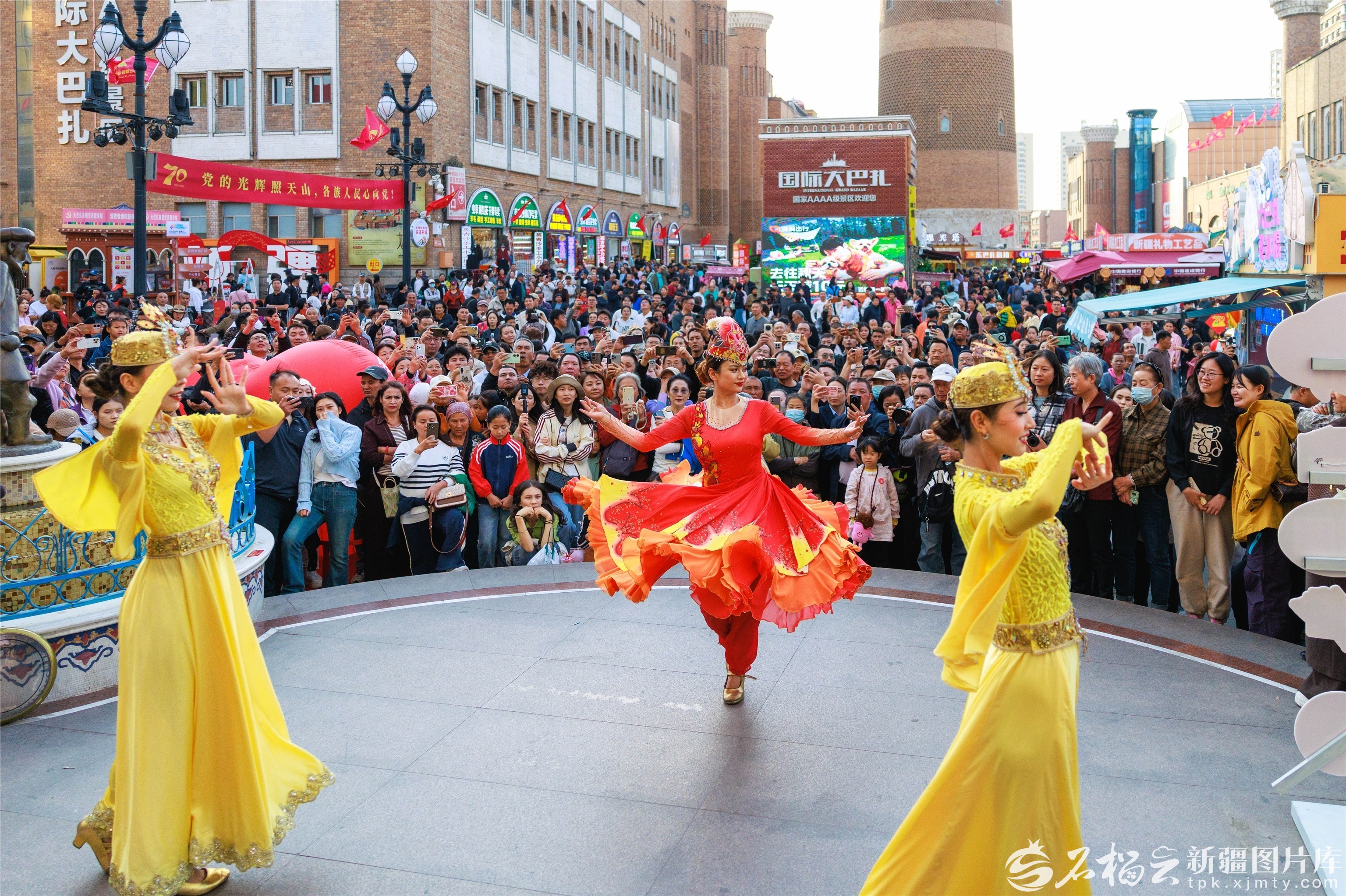 10月1日,來新疆國際大巴扎的游客絡(luò)繹不絕,現(xiàn)場化作一片歡樂的海洋。圖為演員為游客表演舞蹈。 孫振嵩攝