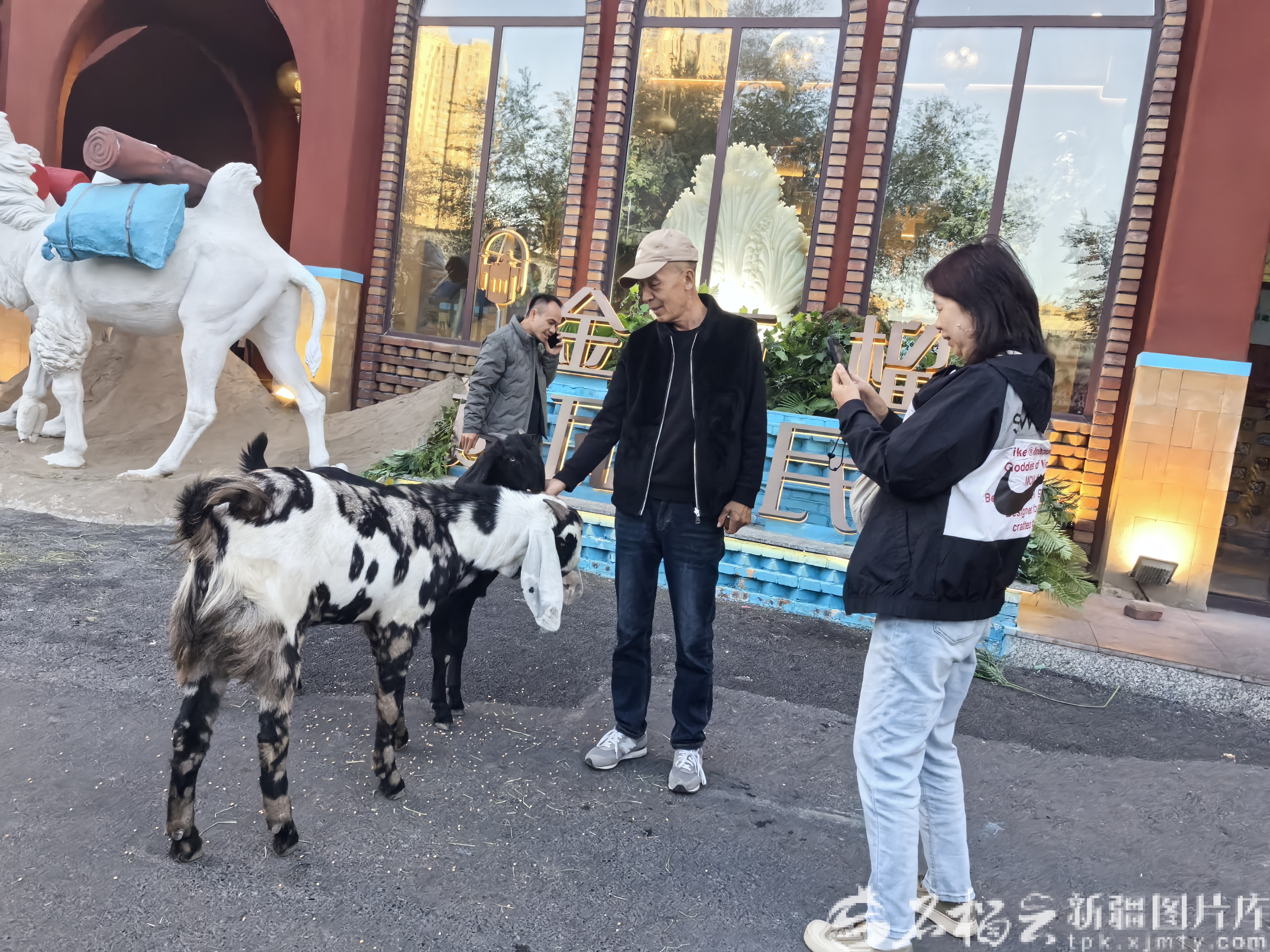 10月3日,烏魯木齊金石榴達瓦孜民街店面前,游客與刀郎羊合影。天山網(wǎng)-新疆日報記者 趙悅攝