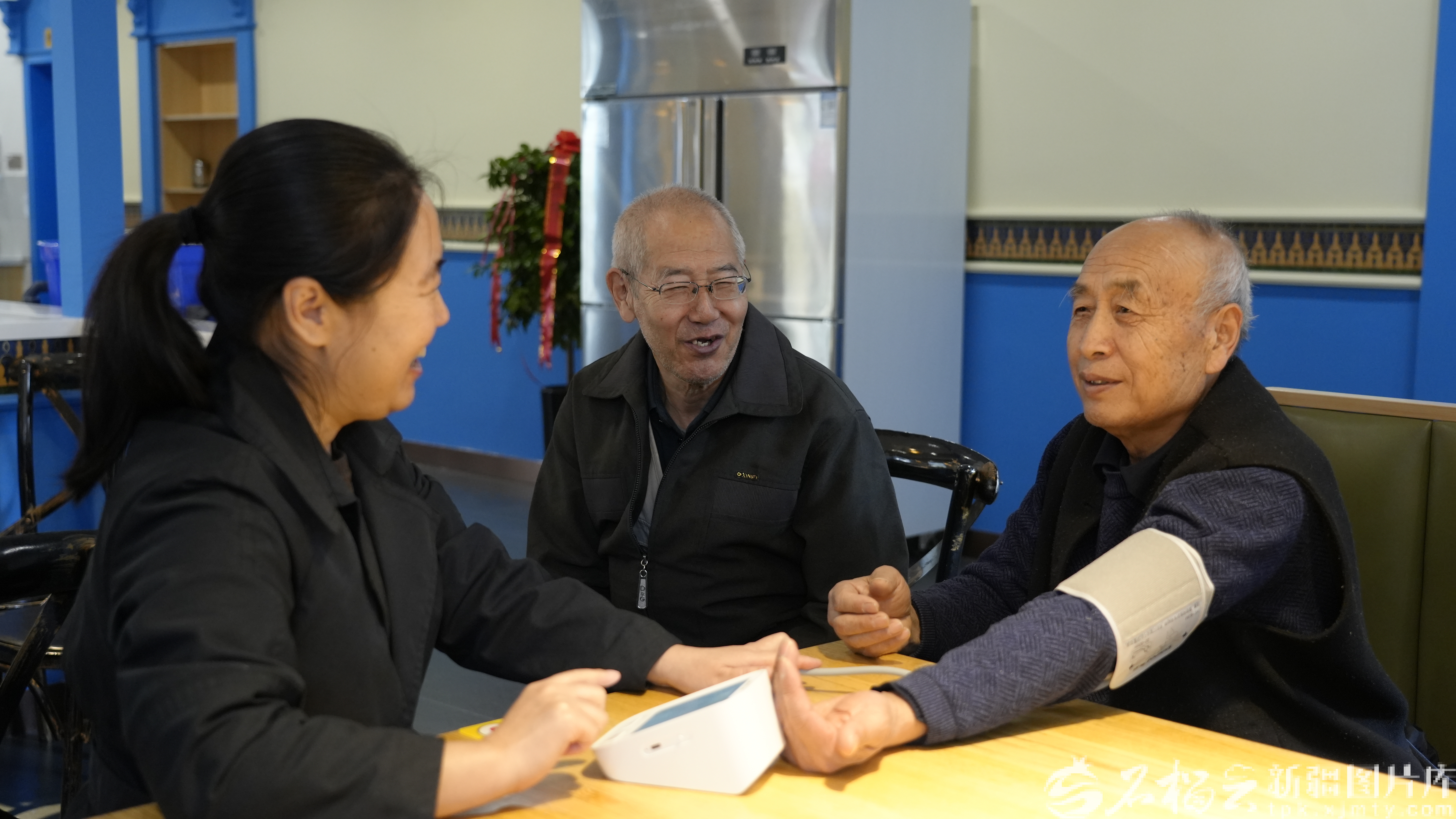10月22日,烏魯木齊市建國路220號院“爸媽食堂”里,老人在量血壓。努爾艾力·圖爾蓀攝