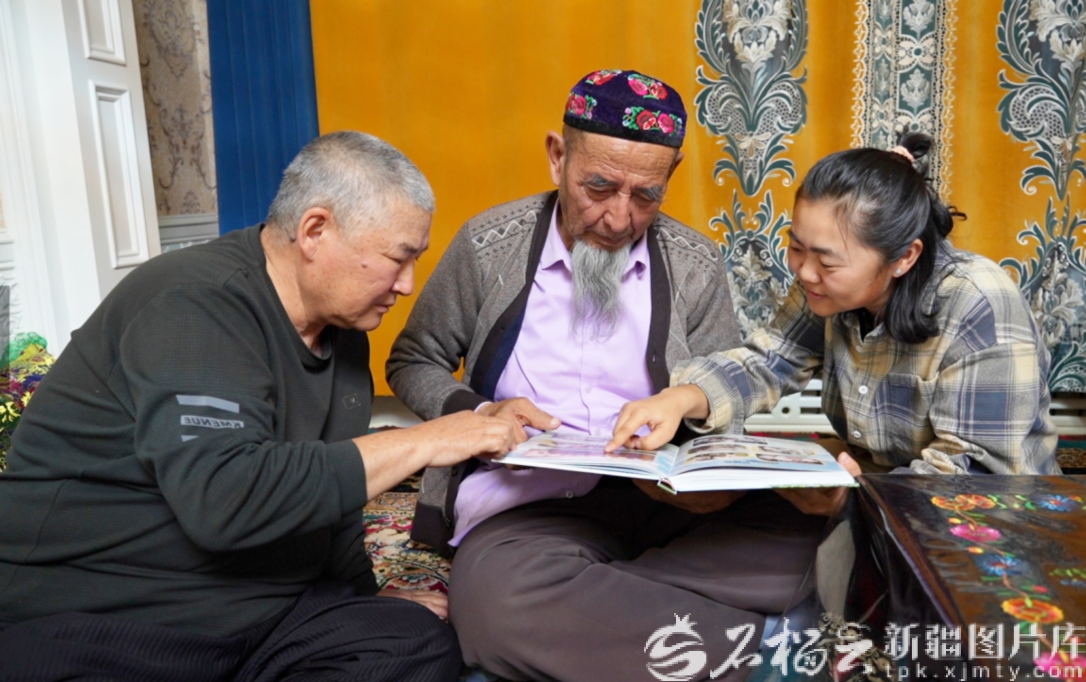 吳玉甫·薩依木(中)翻看相冊里的老照片,講述往事。受訪者供圖