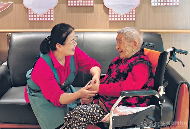 10月27日,在新疆生產(chǎn)建設(shè)兵團(tuán)云洋養(yǎng)老院,護(hù)理員照護(hù)失能老人時(shí),老人伸出手緊緊握住護(hù)理員的手。天山網(wǎng)-新疆日?qǐng)?bào)記者任春香攝