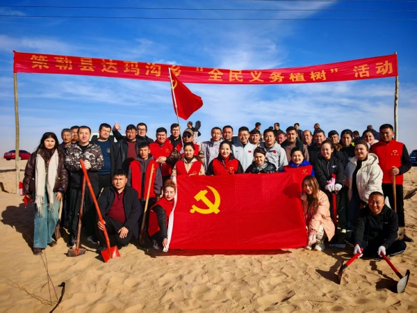 植樹現(xiàn)場(chǎng),干部群眾正在種植紅柳、梭梭等防沙樹種。