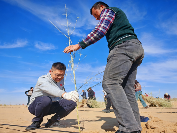 經(jīng)過一整天的辛勤勞作,一排排新栽的樹苗整齊挺立,為深秋沙漠增添了勃勃生機(jī)。這場(chǎng)活動(dòng)不僅讓村莊綠化覆蓋率得到提升,更以植樹為紐帶,讓村“兩委”、駐村工作隊(duì)與村民的心貼得更近?!爸矘湓炝质枪υ诋?dāng)代、利在千秋的好事,我們既要栽得下,更要管得好?!贝妩h支部負(fù)責(zé)人介紹,后續(xù)將建立專人負(fù)責(zé)的管護(hù)機(jī)制,從澆水、防寒到防蟲全程跟進(jìn),確?!霸砸豢?、活一棵、成一片”。駐村工作隊(duì)也表示,將持續(xù)發(fā)揮幫扶優(yōu)勢(shì),推動(dòng)生態(tài)建設(shè)與鄉(xiāng)村振興深度融合,讓綠色成為村莊發(fā)展的鮮明底色。