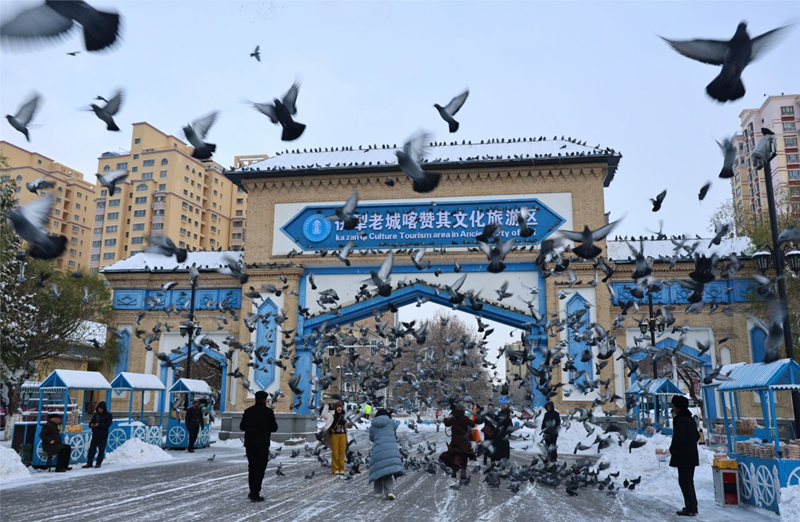 游客在位于伊寧市的伊犁老城喀贊其民俗旅游區(qū)與鴿群互動。栗衛(wèi)平攝