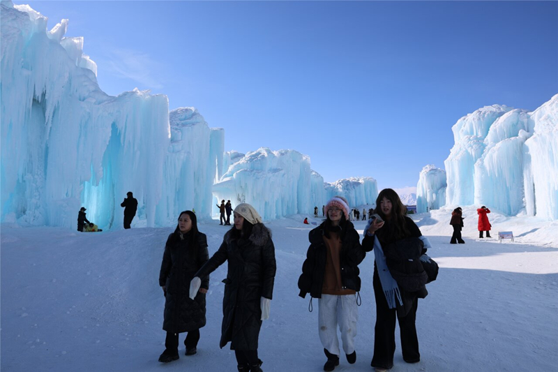 游客在賽里木湖景區(qū)冰雕景點游玩。栗衛(wèi)平攝
