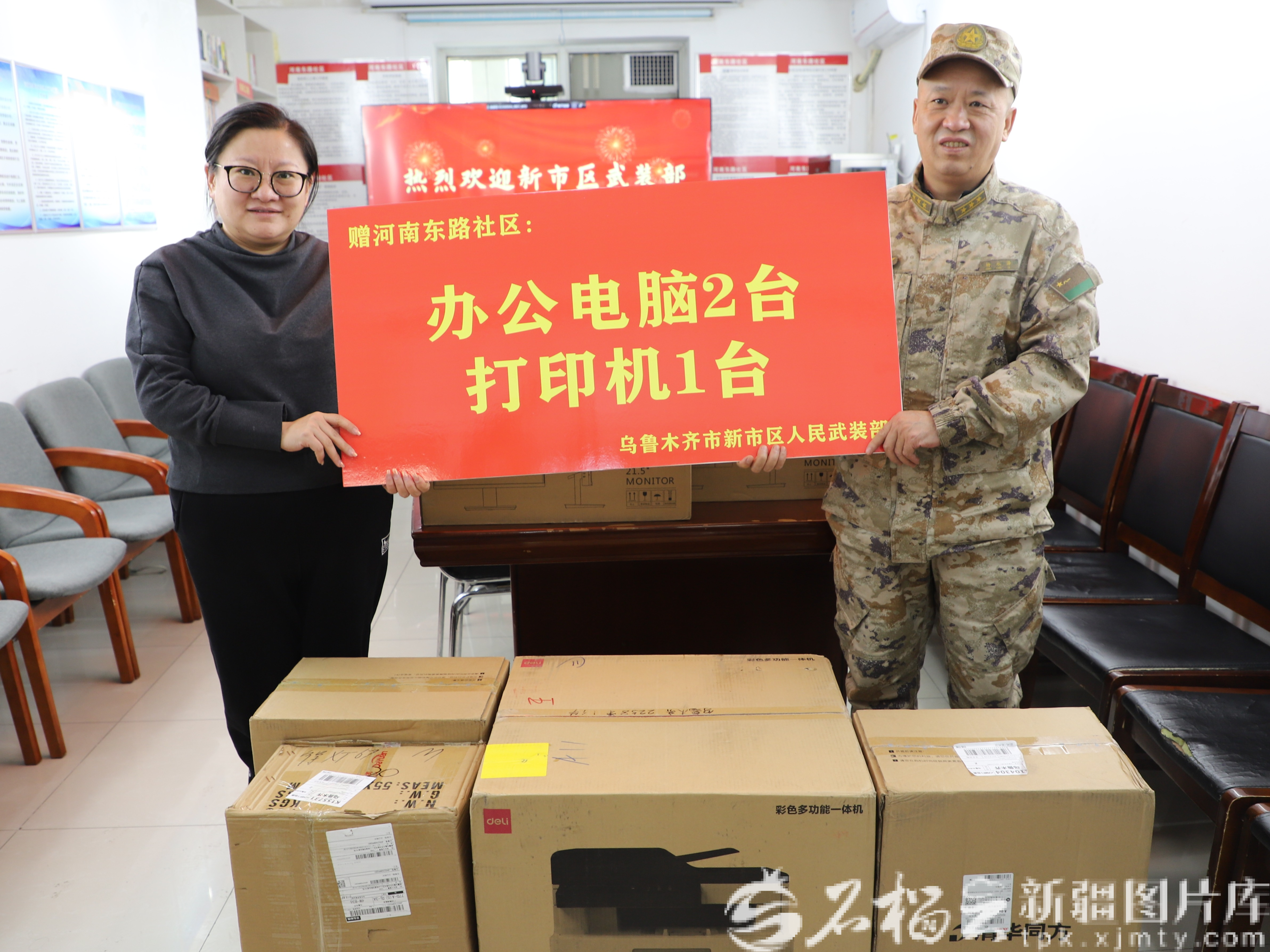 楊永澤(右)代表新市區(qū)人武部向社區(qū)贈送辦公用品。崔建濤攝