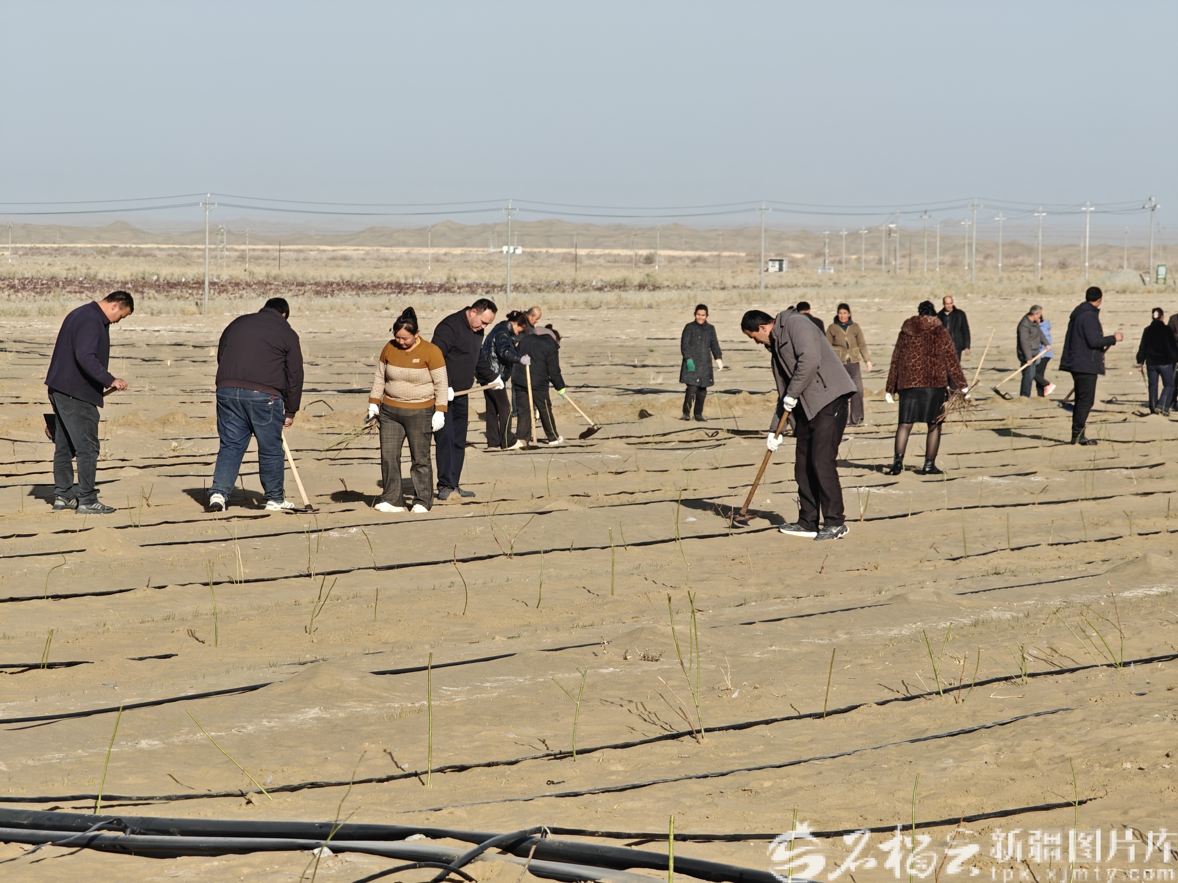 11月28日,于田縣萬花園防沙治沙示范區(qū),村民正在新平整的5000畝沙地上栽種玫瑰苗?;葚S蕾 攝