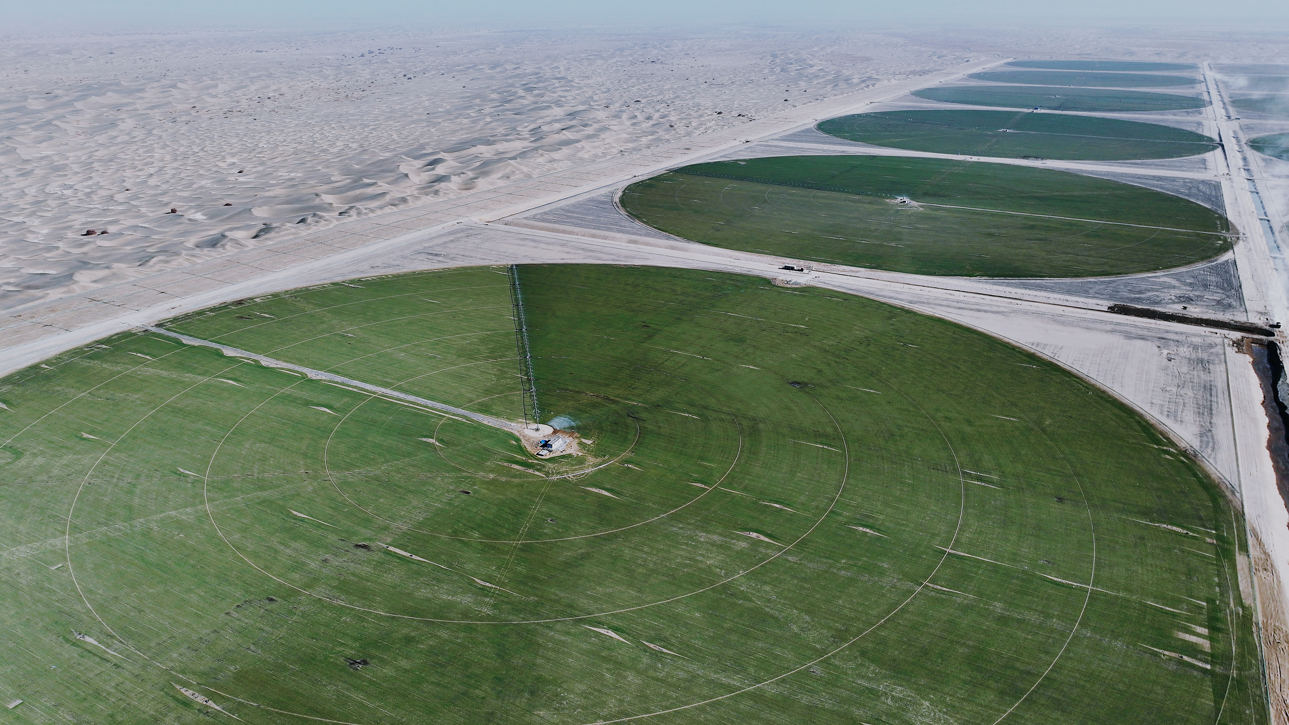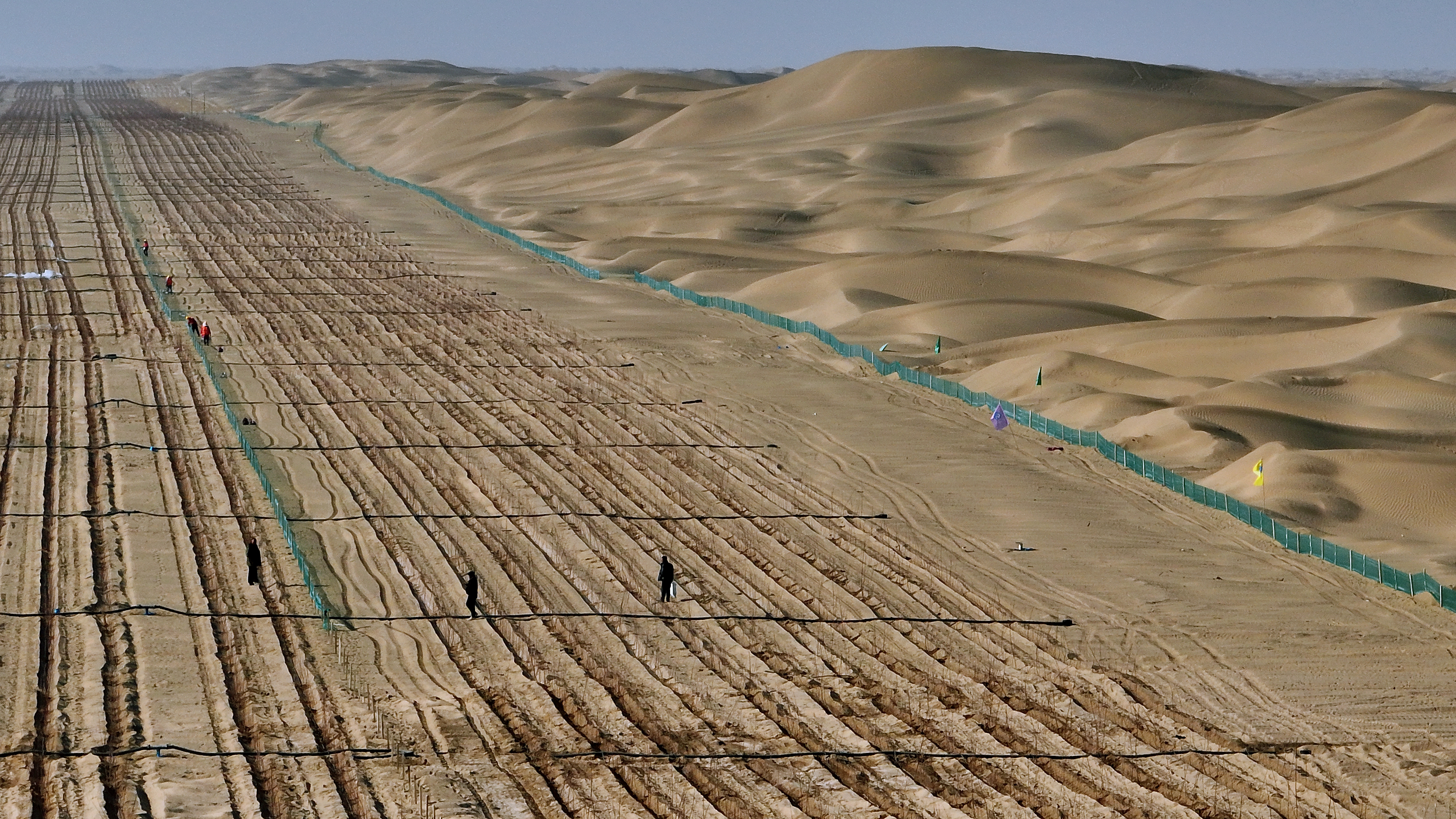 今年,兵團(tuán)第十四師224團(tuán)在塔克拉瑪干沙漠邊緣開墾出7.38萬畝土地,種植小麥、玉米、打瓜、食葵等各類農(nóng)作物。這是麥田里自壓式節(jié)水灌溉設(shè)施正在澆灌(11月26日攝)。王志清攝