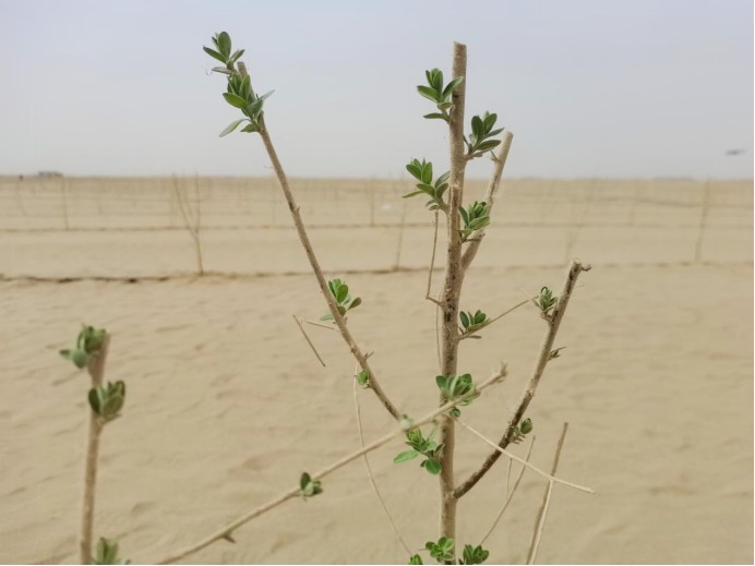 2025年4月,和田縣阿和公路西側(cè)群眾治沙點位的大果沙棗冒出新芽。馬雯萱 攝