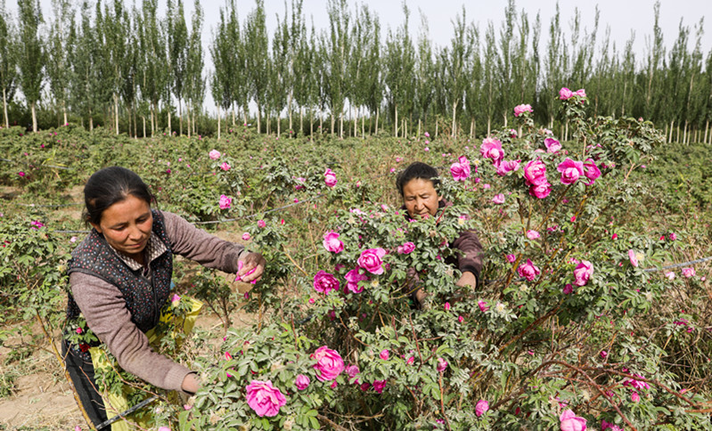 花農(nóng)在于田縣奧依托格拉克鄉(xiāng)的瑰覓特色玫瑰種植基地采摘玫瑰花。許曉龍 攝