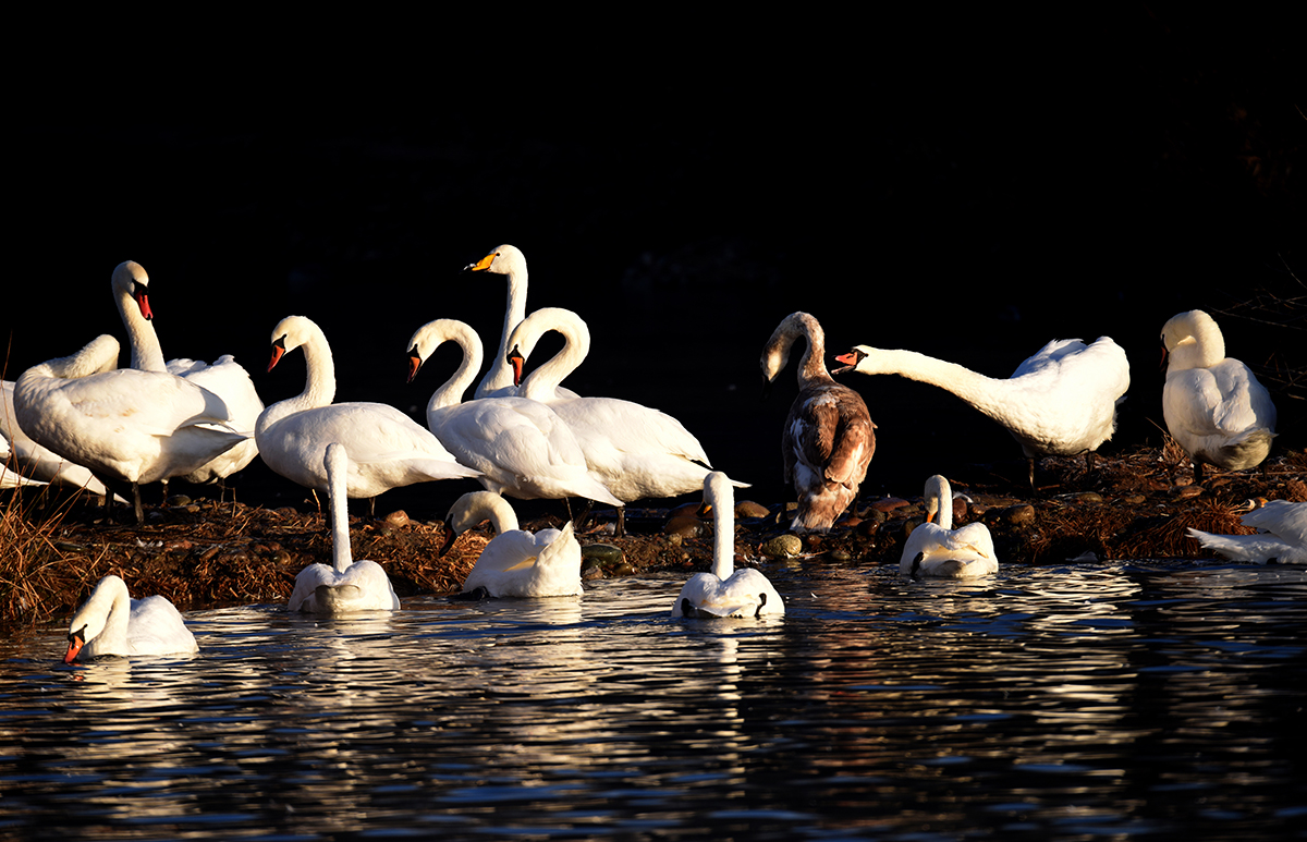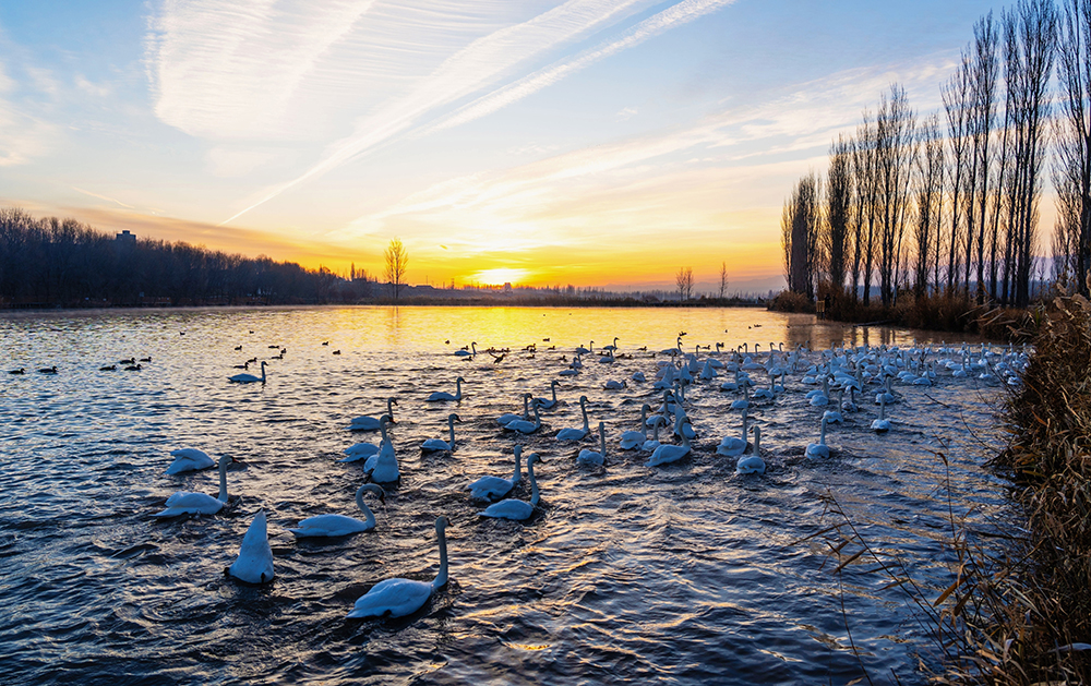 泉面氤氳的晨霧,是冷夜呼出的最后一息暖意,為這片水域籠上了一層流動(dòng)的薄紗。霞光如一位從容的畫家,以天際為調(diào)色盤,蘸取玫瑰金、淺橘與柔緋,輕輕點(diǎn)染——于是整片水域化作了一幅瑰麗的畫卷。在這如夢(mèng)的底色上,533位遠(yuǎn)客——優(yōu)雅的疣鼻天鵝與雍容的大天鵝,正悠然蘇醒。