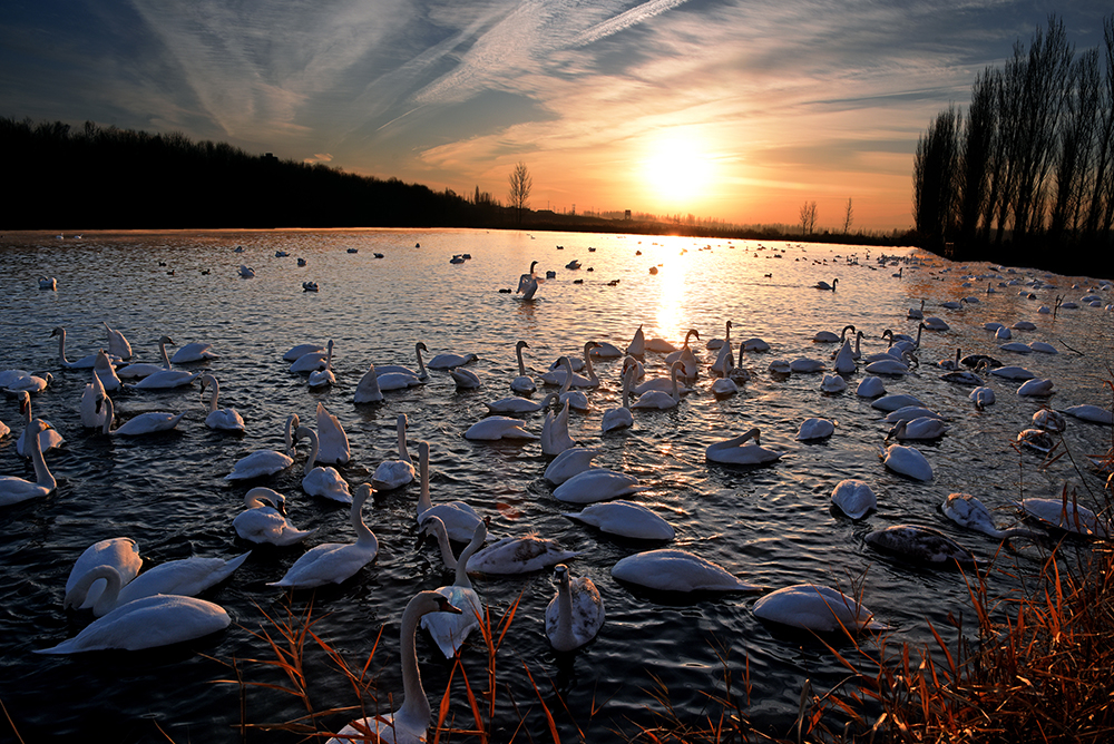 它們或曲項(xiàng)如問(wèn),長(zhǎng)喙輕點(diǎn),在如鏡的水面泛起一圈圈漾著金邊的漣漪;或舒翅欲飛,在氤氳的暖霧與璀璨的霞光間,劃出一道道晶亮的軌跡,仿佛不是在寒水中游弋,而是在熔化的金波上滑行。更有對(duì)對(duì)愛(ài)侶,長(zhǎng)頸交疊,彎成一顆顆溫柔的心的形狀,倒影落在溫暖的泉水中,宛如竊竊私語(yǔ),訴說(shuō)著千里征途中不曾分離的繾綣。