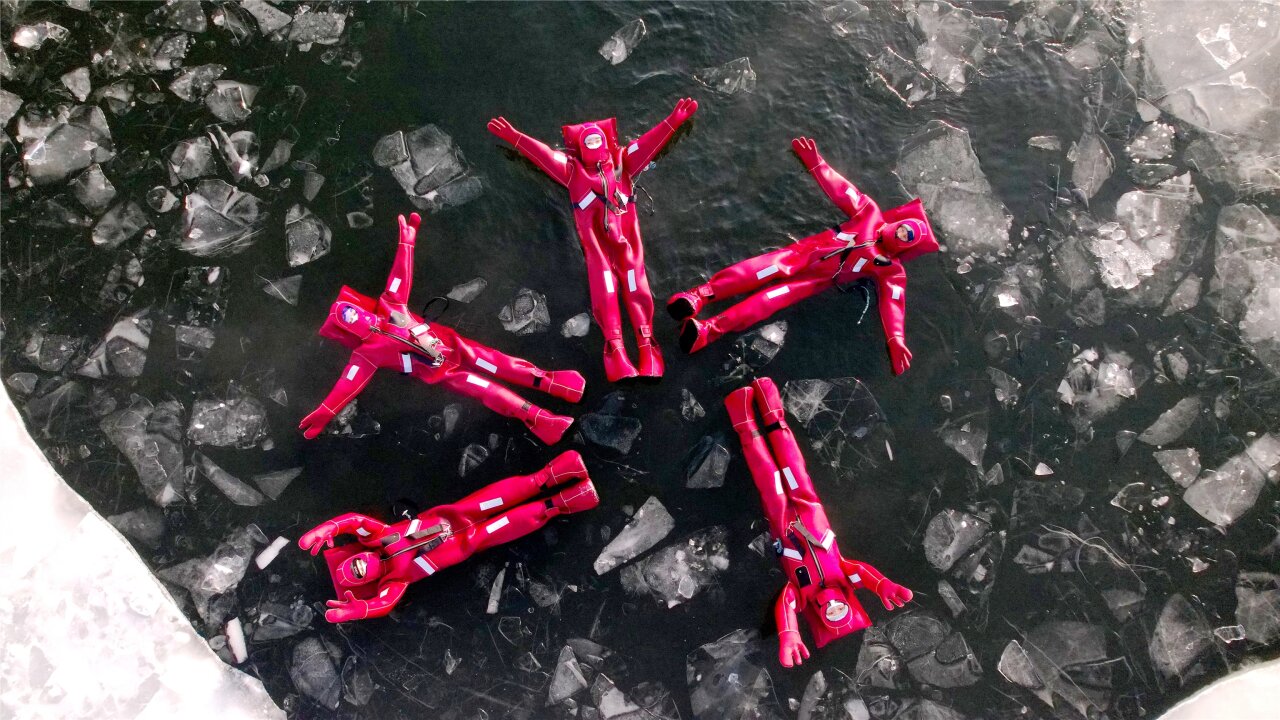 12月5日,在阿勒泰市阿葦灘鎮(zhèn),不少游客身著紅色特制防寒服,在阿勒泰冰浮俱樂(lè)部體驗(yàn)冰浮項(xiàng)目。張福新攝