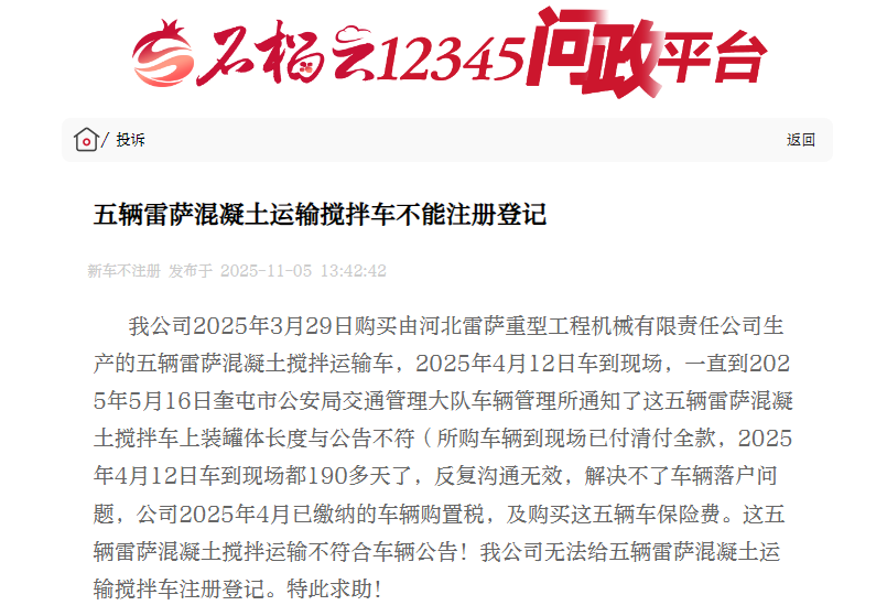 “花那么多錢買的車,擱置半年多還是‘黑戶’,到現(xiàn)在連路都上不了,這不是一堆廢鐵嗎?”近期,網(wǎng)友郭先生在石榴云12345問政平臺留言,反映今年3月29日自己的公司花144萬元,從包頭市奧源新材料科技有限公司購入了由河北省張家口雷薩重型工程機(jī)械有限責(zé)任公司北京分公司生產(chǎn)的5輛混凝土攪拌運輸車,卻因車輛罐體尺寸與國家工信部發(fā)布的參數(shù)標(biāo)準(zhǔn)不符造成無法落戶,與經(jīng)銷商和廠家溝通后,雙方各執(zhí)一詞未能解決,以致陷入既不能落戶上牌也無法退車的兩難困境。