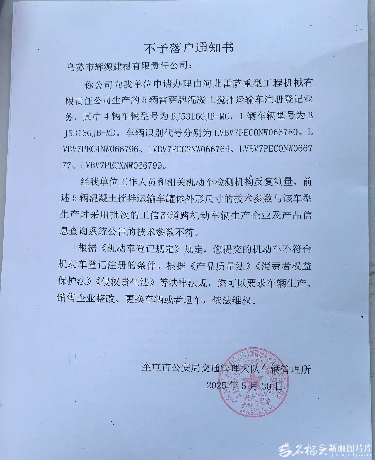 根據(jù)屬地落戶原則,5月16日,郭先生帶著司機(jī)將此前到貨的五輛臨牌攪拌運輸車,開往奎屯市車管所辦理特種車輛注冊登記,但交警在檢測審核后告知郭先生,這五輛攪拌運輸車罐體長度超過工信部公布的參數(shù)標(biāo)準(zhǔn)?!拔耶?dāng)時就蒙了,隨后一直聯(lián)系經(jīng)銷商和廠家,但他們一直說今天派人來處理,明天派人來解決,但就是沒有一個明確結(jié)果。期間,也曾考慮過起訴維權(quán),但因咨詢后需付7萬多元的律師費及保全費用就猶豫了,也有希望能解決問題的想法。12月初,廠家說要派人來處理這個問題,時至今日問題仍沒有解決。”郭先生無奈說。