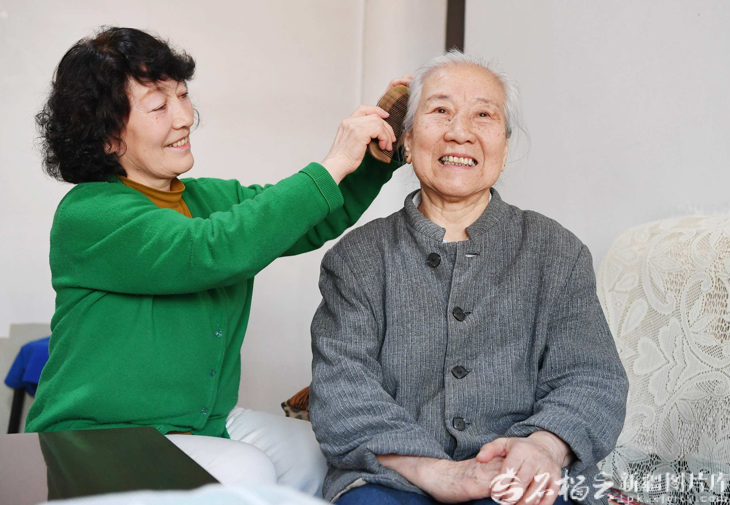 2月15日 ,在烏魯木齊市天山區(qū)二道橋街道二道橋社區(qū)巴里坤小區(qū)馬志林(右)家中,熱伊汗·拍合熱?。ㄗ螅婉R志林老人梳頭。