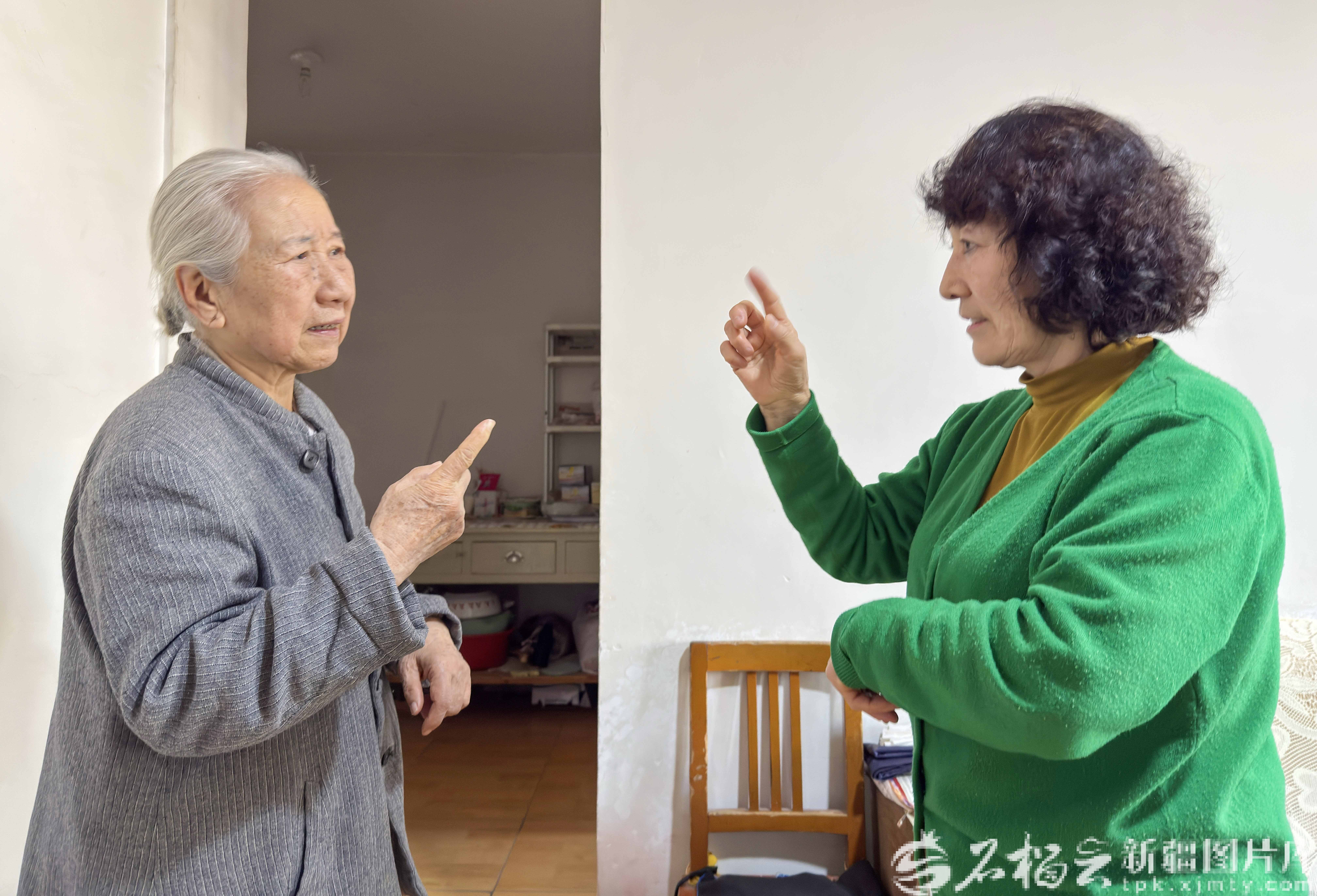 2月15日 ,在烏魯木齊市天山區(qū)二道橋街道二道橋社區(qū)巴里坤小區(qū)馬志林(左)家中,熱伊汗·拍合熱丁(右)和老人用手語進行交流。