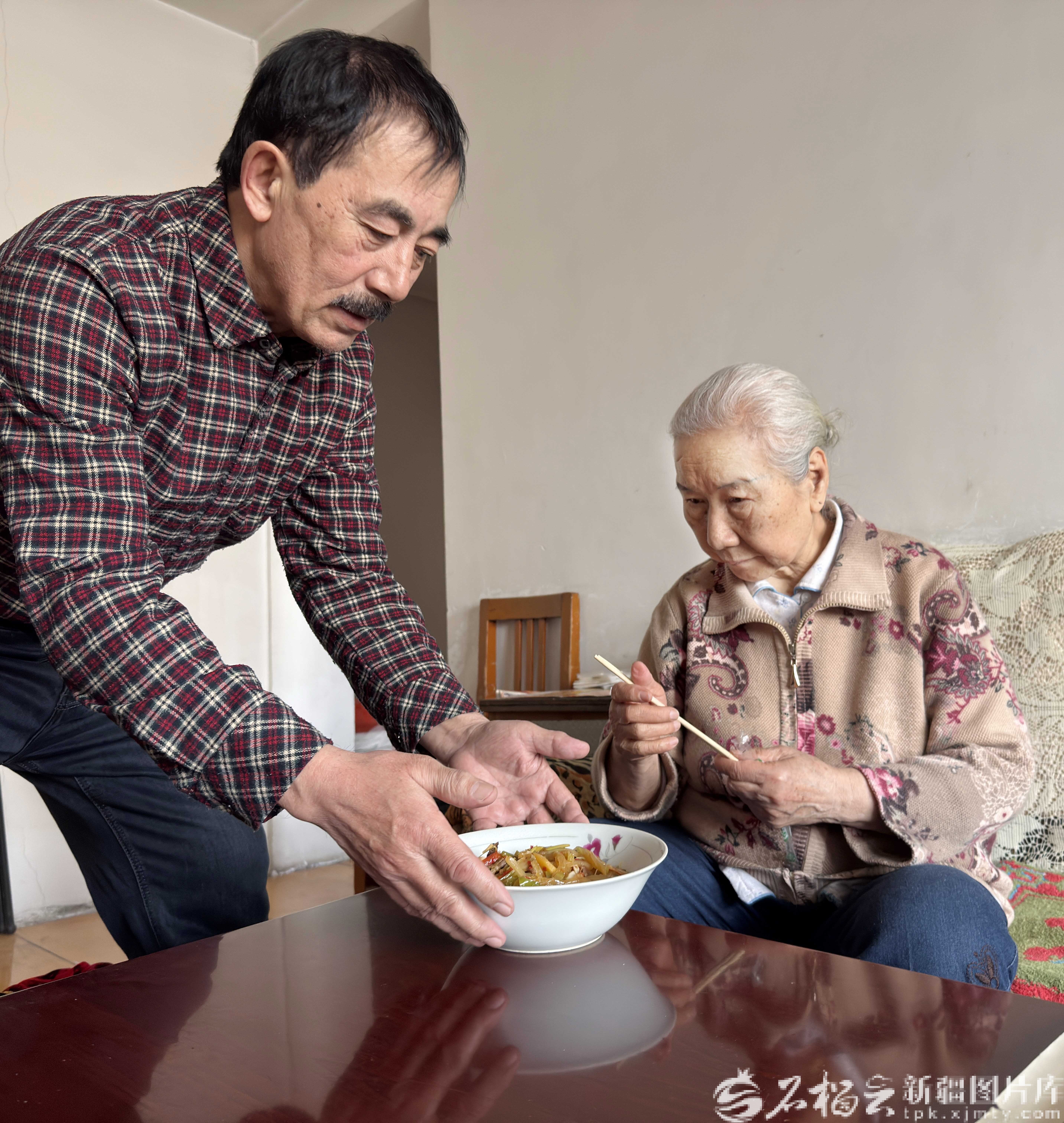 2019年,馬志林確診乳腺癌,熱伊汗與丈夫阿布來提·帕孜力輪流值守,衣不解帶守在病床前40余天。熱伊汗細心照顧,用手語傳遞安慰與力量;阿布來提·帕孜力則負責(zé)奔波求醫(yī)、采購物資,默默扛起后勤重擔(dān),夫妻二人攜手陪伴馬志林戰(zhàn)勝病魔。如今83歲的馬志林,在二人的悉心照料下身體硬朗,三人形影不離,相處得如同親人?!八俏业募依锶耍液驼煞蚨挤挪幌滤??!睙嵋梁沟脑捳Z樸實而真摯。