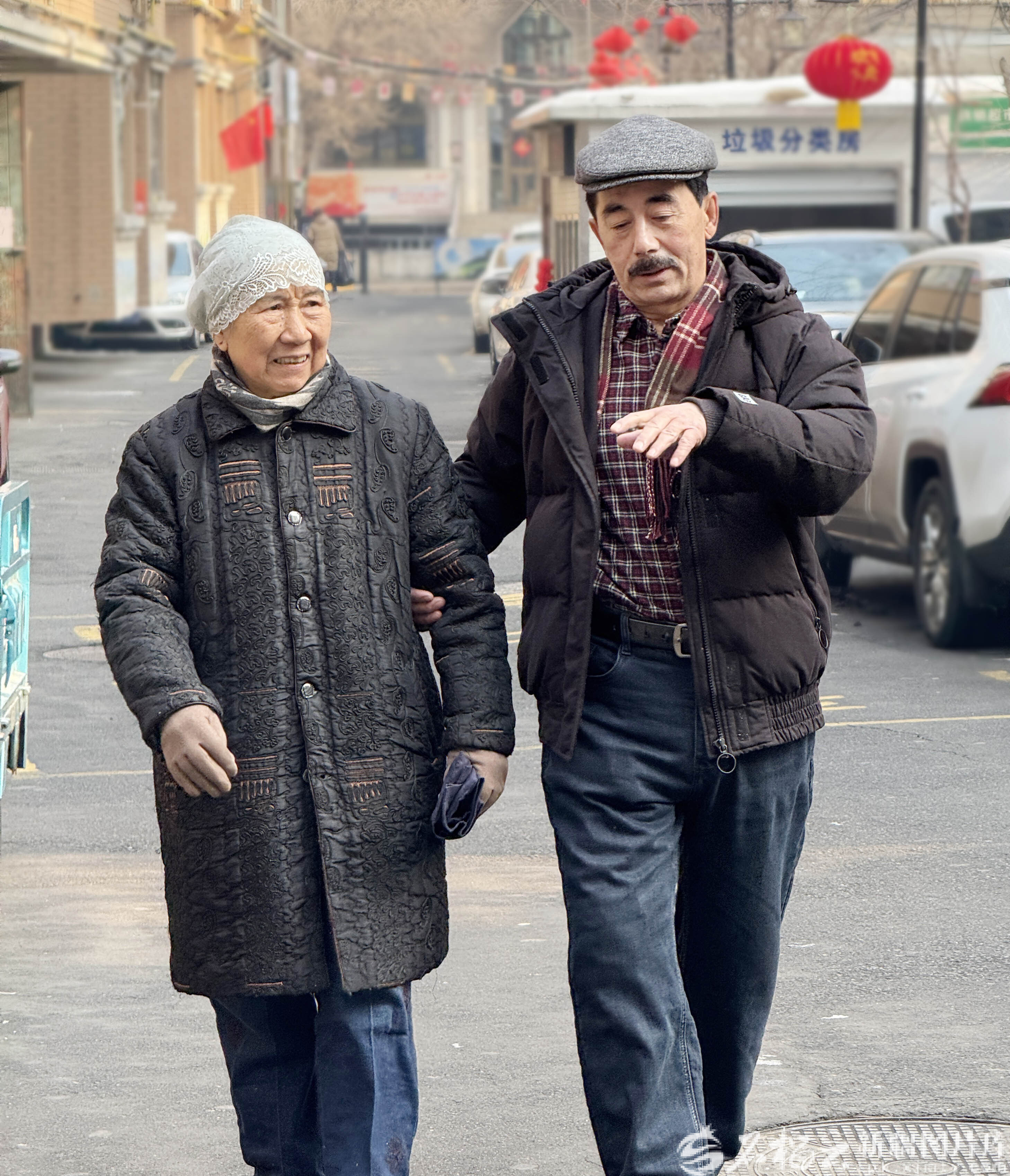 2月15日 ,熱伊汗的丈夫阿布來提·帕孜力(左)陪同馬志林老人散步并用手語進行交流。