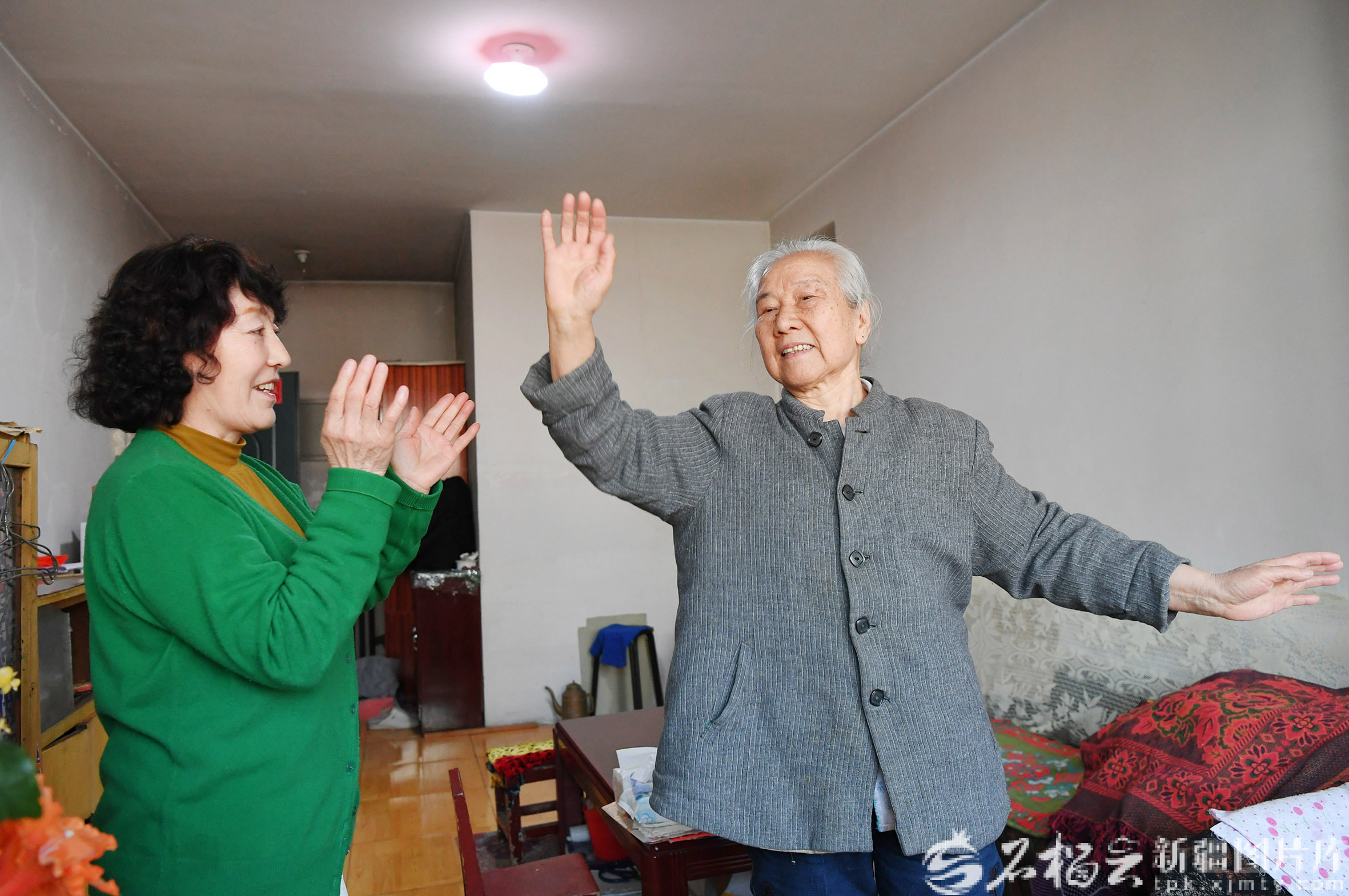 2月15日 ,在烏魯木齊市天山區(qū)二道橋街道二道橋社區(qū)巴里坤小區(qū)馬志林(右)家中,馬志林老人跳起了跟熱伊汗·拍合熱?。ㄗ螅W(xué)的舞蹈。