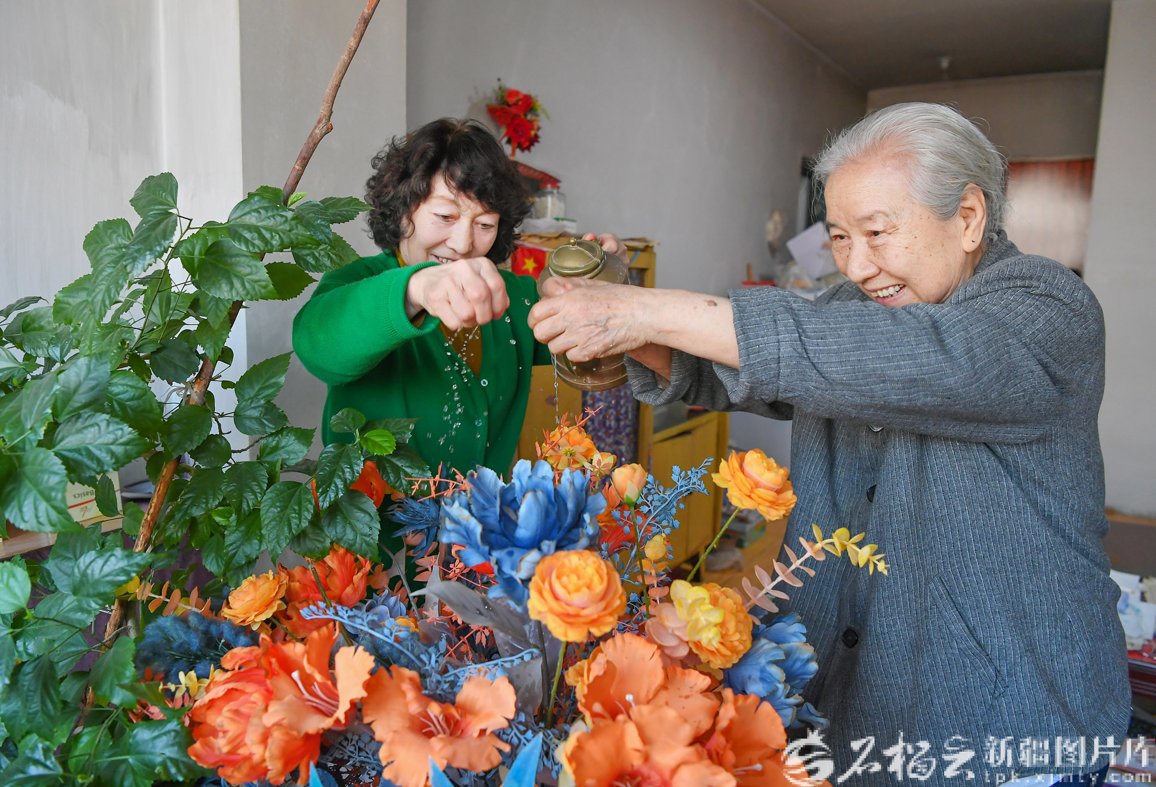 2月15日 ,在烏魯木齊市天山區(qū)二道橋街道二道橋社區(qū)巴里坤小區(qū)馬志林(右)家中,熱伊汗·拍合熱丁(左)和老人一起澆花。