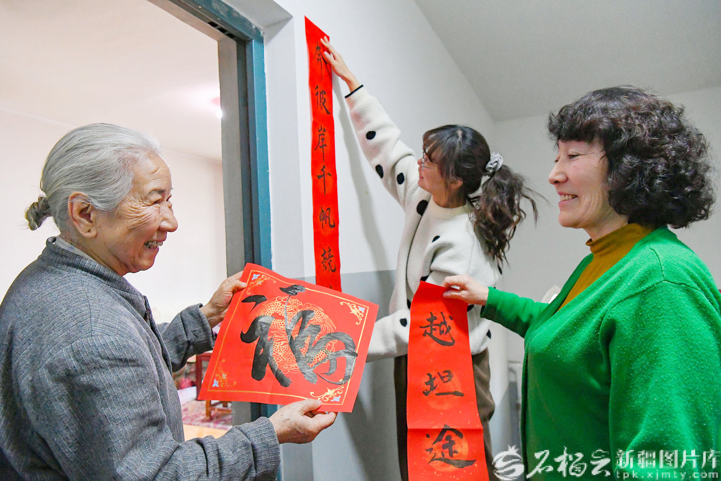 2月15日 ,在烏魯木齊市天山區(qū)二道橋街道二道橋社區(qū)巴里坤小區(qū)熱伊汗·拍合熱?。ㄓ遥┖蜕鐓^(qū)干部幫馬志林(左)貼春聯(lián)。
