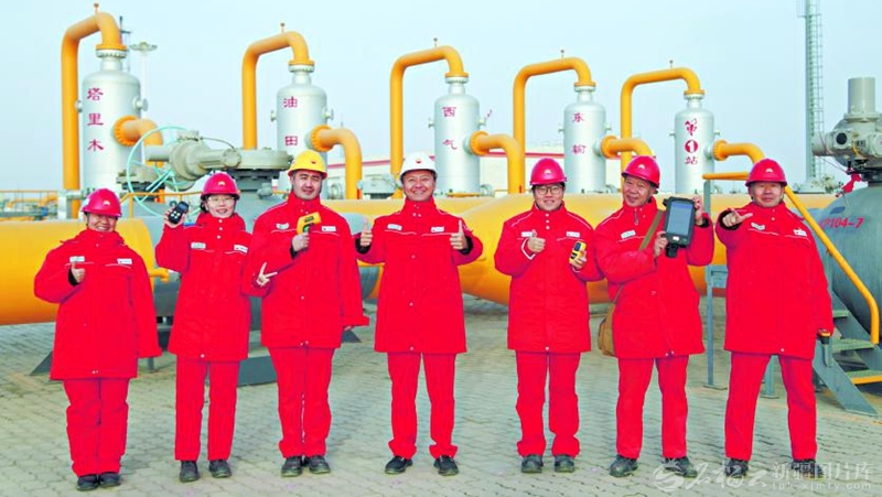 2月20日,中石油塔里木油田公司輪南油氣儲(chǔ)運(yùn)中心西氣東輸?shù)谝徽締T工巡檢后拍照留念。 譚明明攝