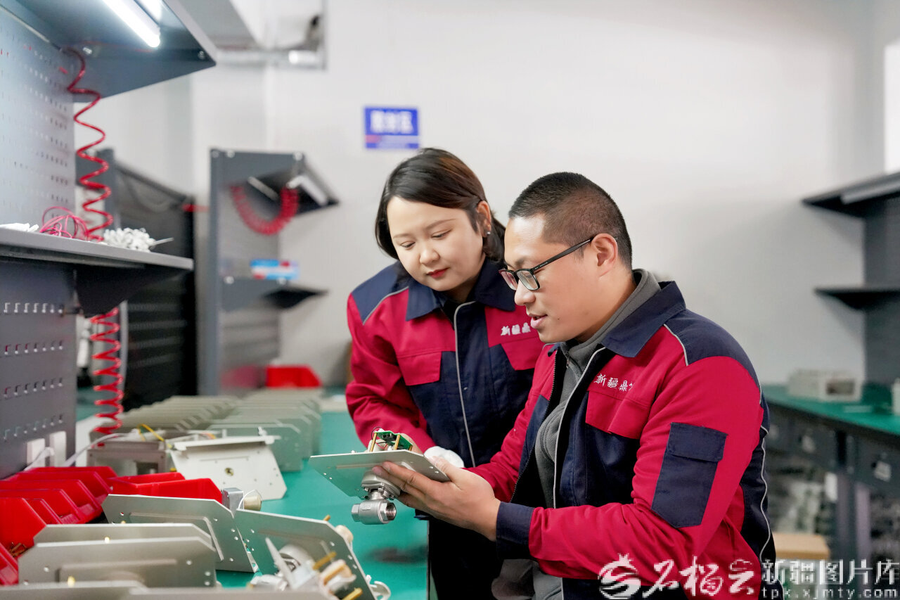 2月24日,在新疆鼎飛益智能科技有限公司,沙灣市柔性引進(jìn)人才朱小龍博士(右)正在給員工示范礦用無線自動(dòng)灑水降塵裝置主機(jī)裝配技巧,幫帶本土人才。楊文秀攝
