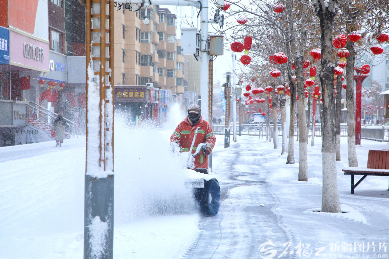 2月24日,環(huán)衛(wèi)工人在五家渠市將軍街步行街清理積雪,保障市民出行安全。魏新江攝