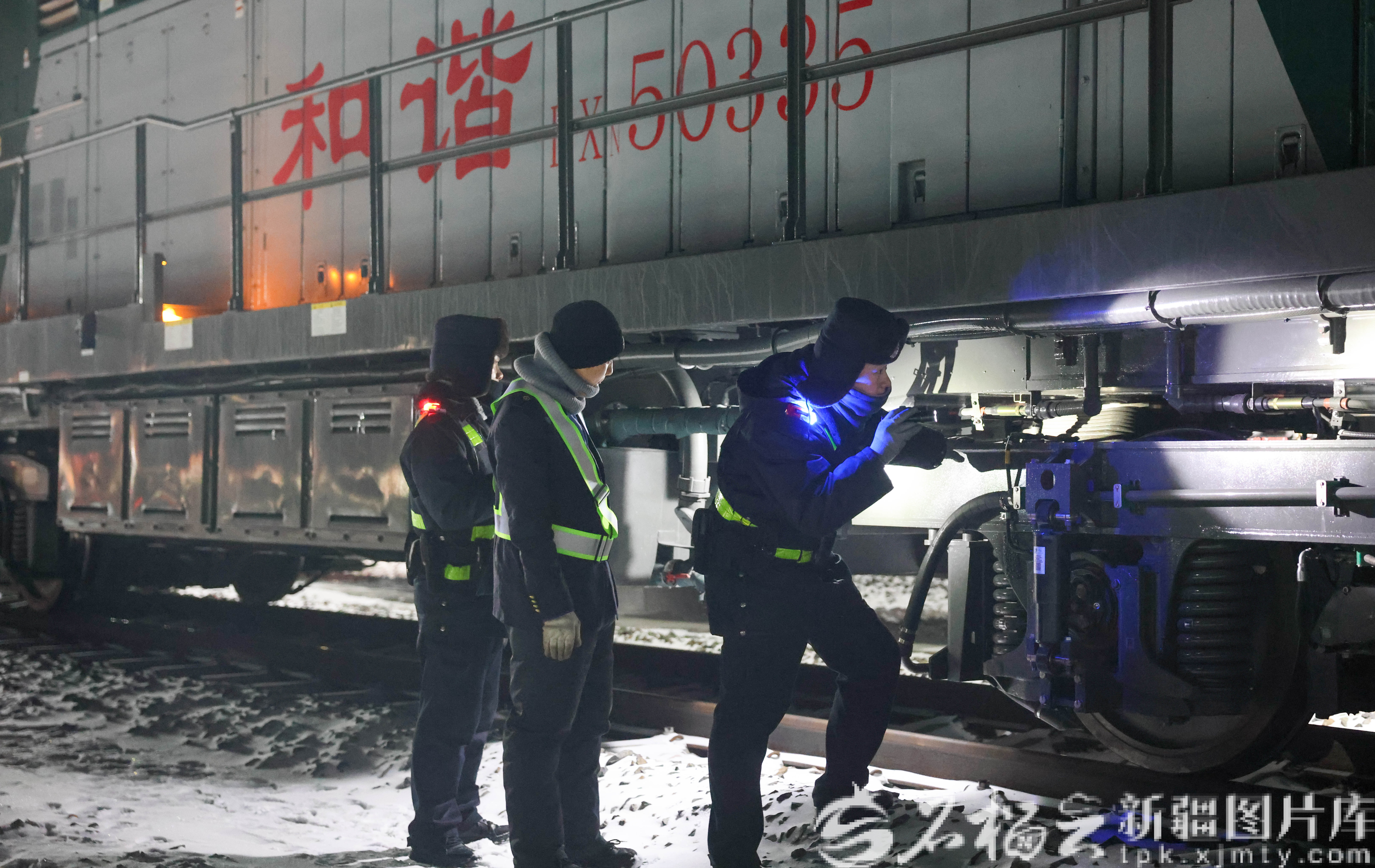 2月15日晚,阿拉山口邊檢站執(zhí)勤民警在鐵路口岸查驗一輛出境班列。曹夢陽 攝